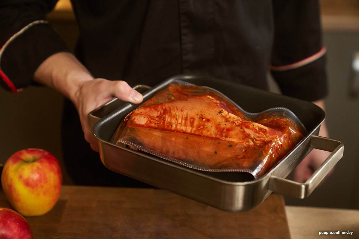 — Отправляем свиную рульку в духовку прямо в пакете, запекаем согласно инструкции на упаковке. Если хотите, чтобы на мясе образовалась золотистая корочка, то в самом конце, минут за пять до полной готовности, снимите верхнюю часть пленки и смажьте рульку смесью меда с кетчупом. В принципе, корочка в любом случае должна получиться, если все сделаете правильно, — но так выходит еще красивее.