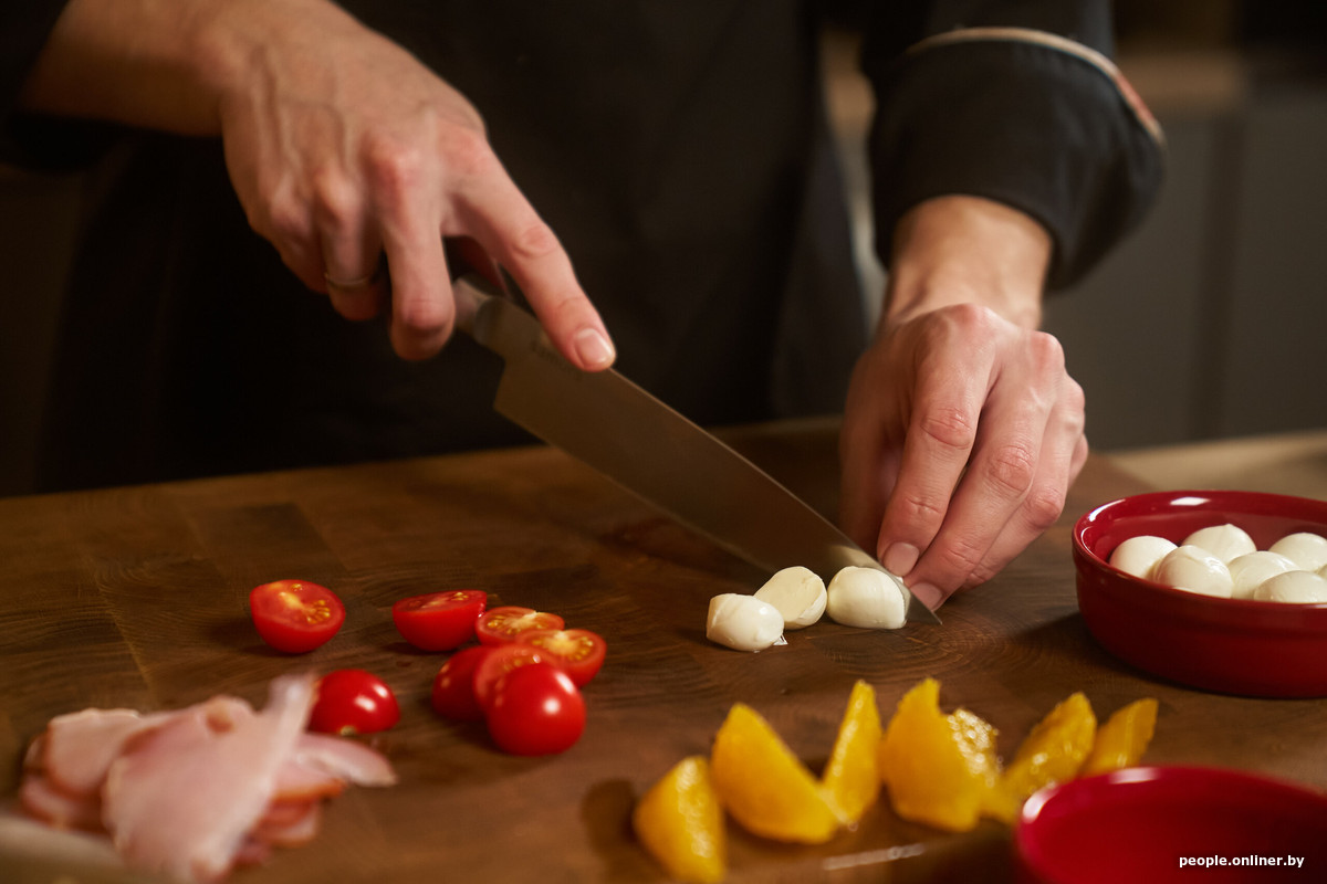 Шеф на чистом опыте настрогал все ножом и уже готовится приступать к следующему ингредиенту — филе… апельсина.