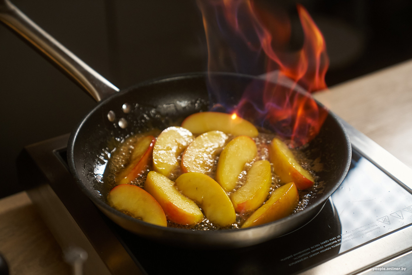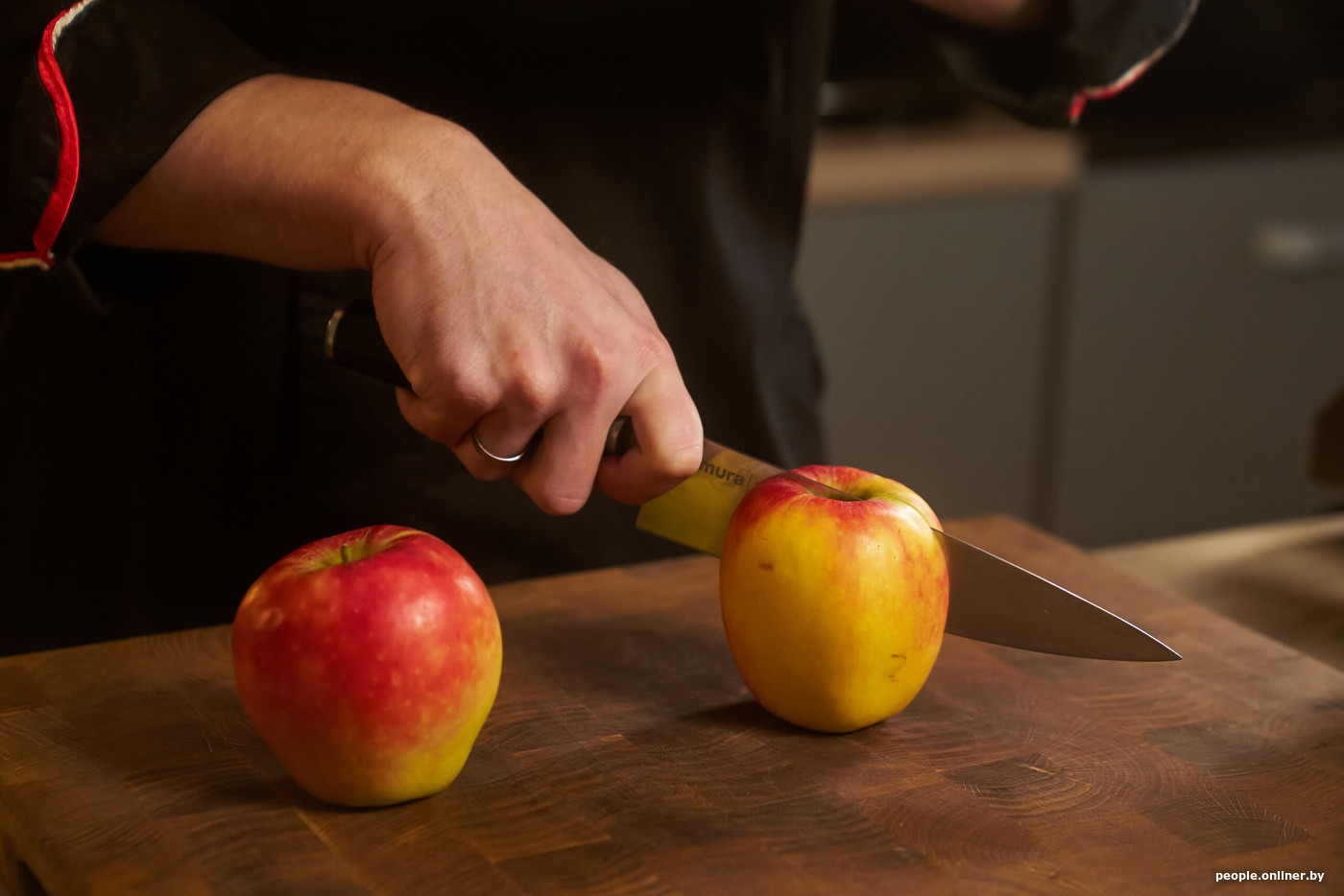 Что ж, считайте, полдела уже сделано. Про мясо на время забываем и беремся за яблоки — они у нас будут гарниром к рульке. Дмитрий советует брать те, что покислее и потверже, все равно очень скоро их агрегатное и вкусовое состояние будет доведено до полной противоположности.