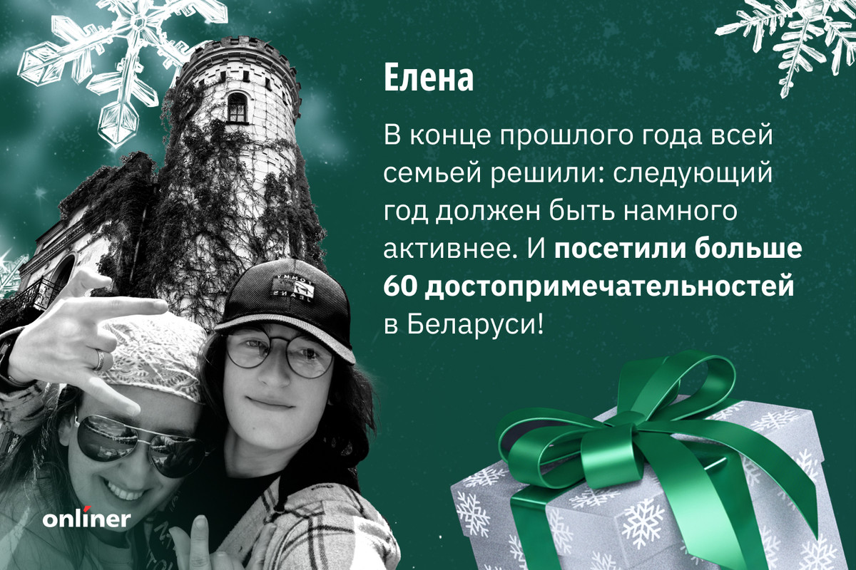 Елена в Новый год загадала не одно конкретное желание, а целый яркий насыщенный год. Она решила посетить места, которые откладывала годами, и стала путешествовать по Беларуси — концерты, экскурсии, исторические памятники и незабываемые открытия.