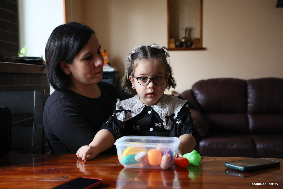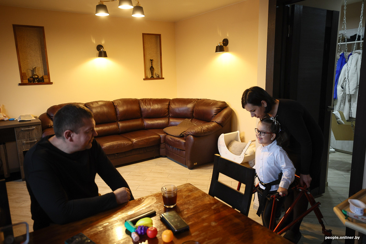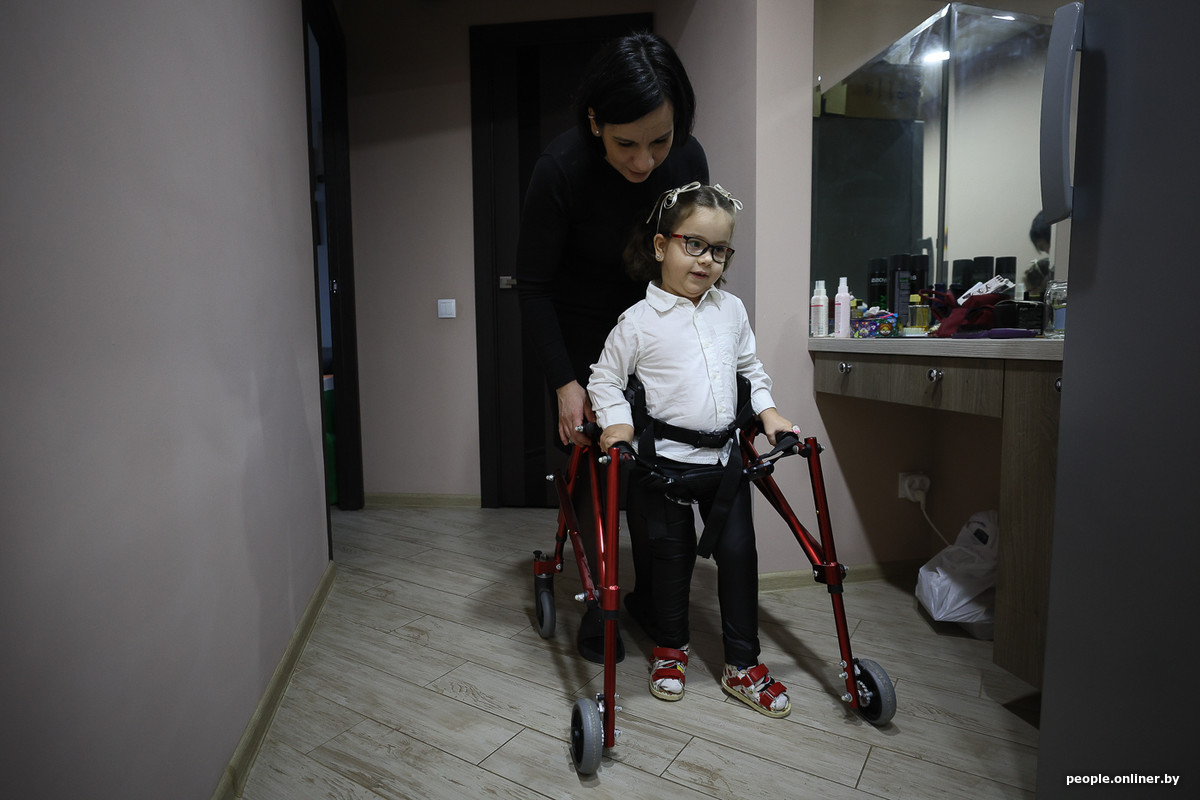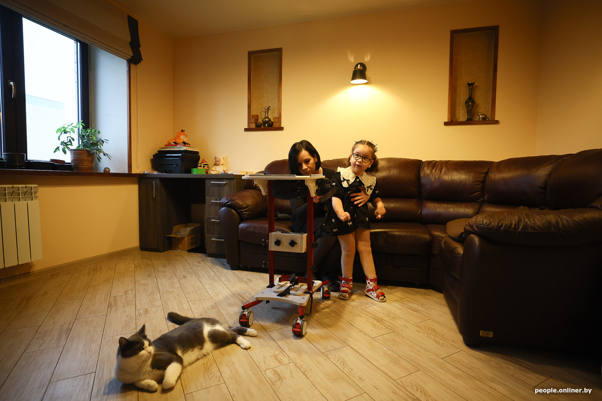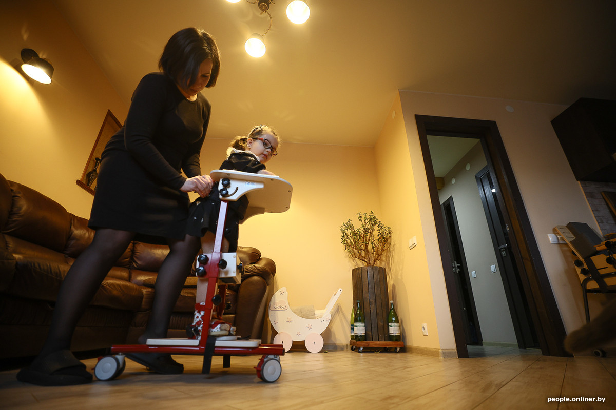 Когда мы заходим в квартиру в центре Узды, Марта уже ждет нас — в своем самом нарядном платье. Общаться девочка очень любит: сразу же начинает громко рассказывать пока совершенно незнакомым людям, какие игры для них подготовила. Она была бы рада встретить незнакомцев у порога, но самостоятельно передвигаться Марта не может. Несмотря на то что ей 4 года, малышка пока так и не сделала свои первые шаги. Хотя родители продолжают верить, что это еще обязательно произойдет.