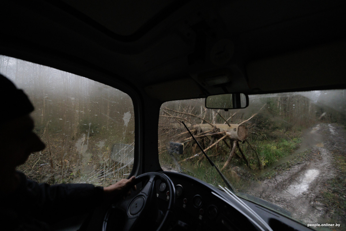 Дорога к болоту Ельня пролегает через густой, заваленный сухими елями, лес. Декабрь, Витебская область.
