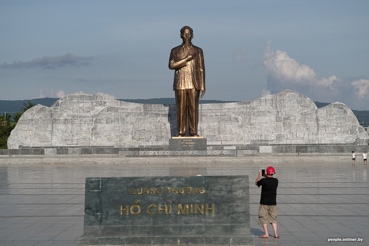 Турист фотографирует огромную фигуру Хо Ши Мина на острове Фукуок. Октябрь, Вьетнам.