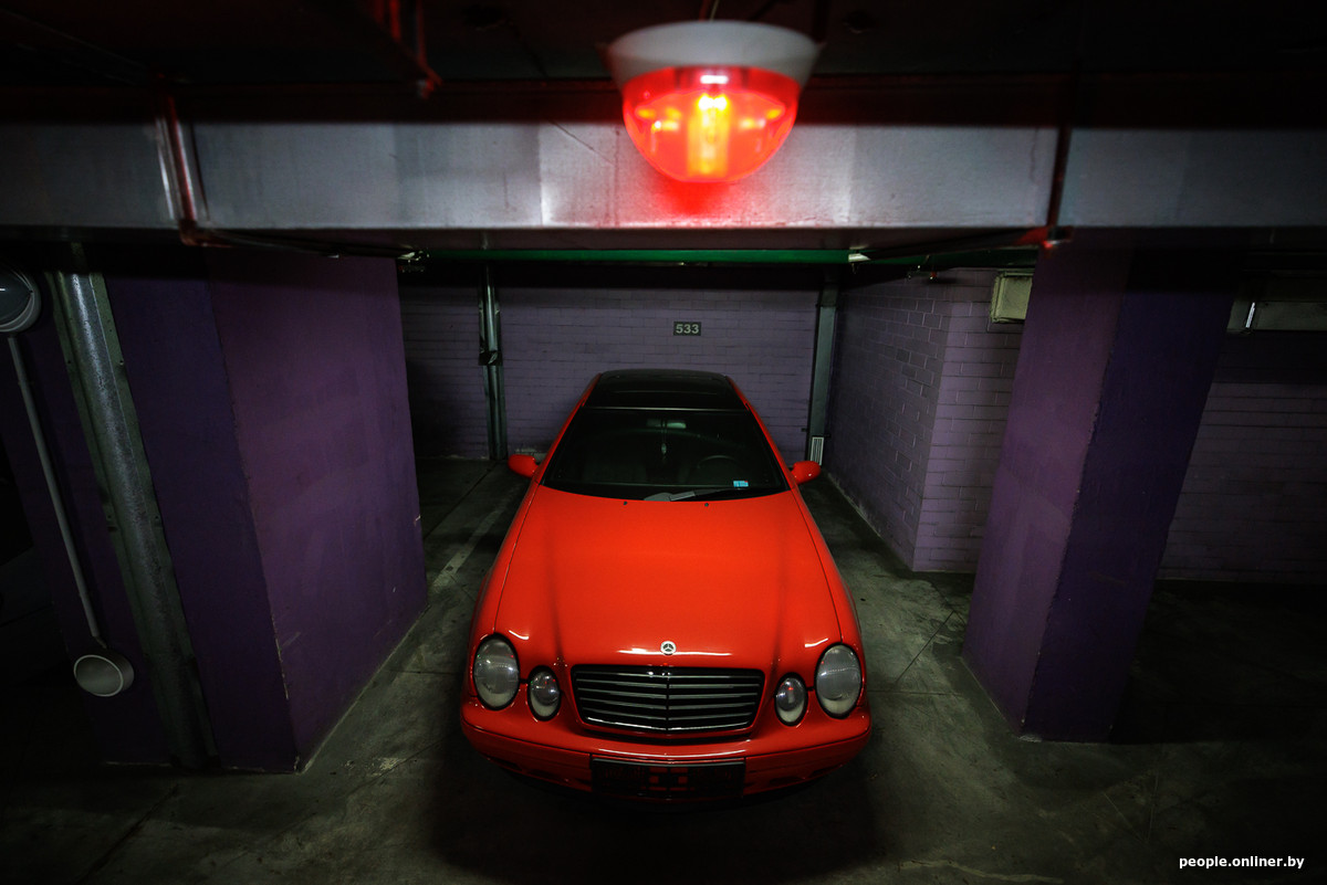Красный Mercedes зимует на одном из паркингов ТЦ столицы. Декабрь, Минск.