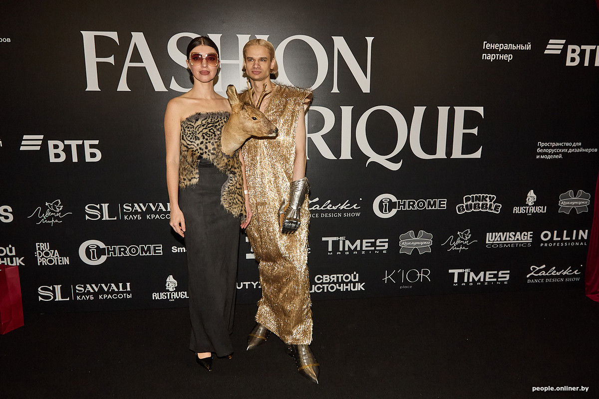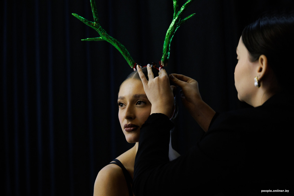 На модный показ Fashion Fabrique дизайнер Алена Ацапкина пришла в костюме с головой косули. Ноябрь, Минск.