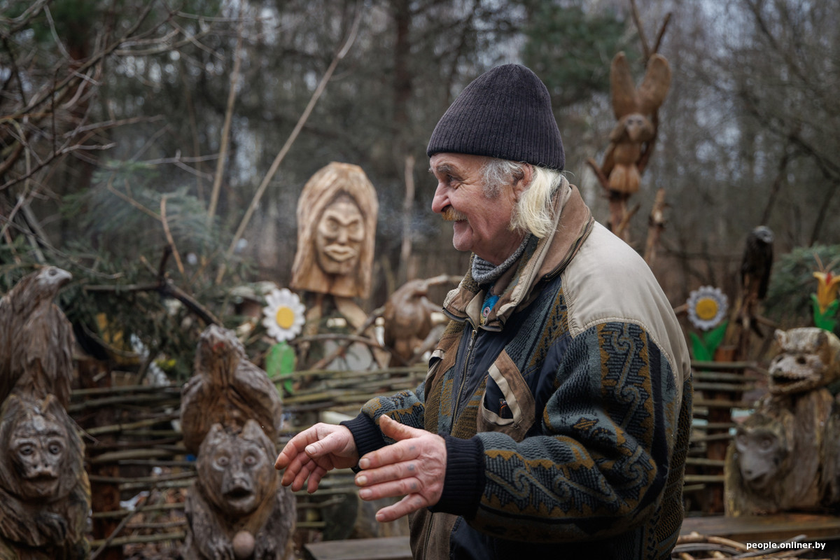 Мастер-самоучка по дереву Александр Павлович превратил деревню в музей необычных скульптур. Февраль. Минская область.