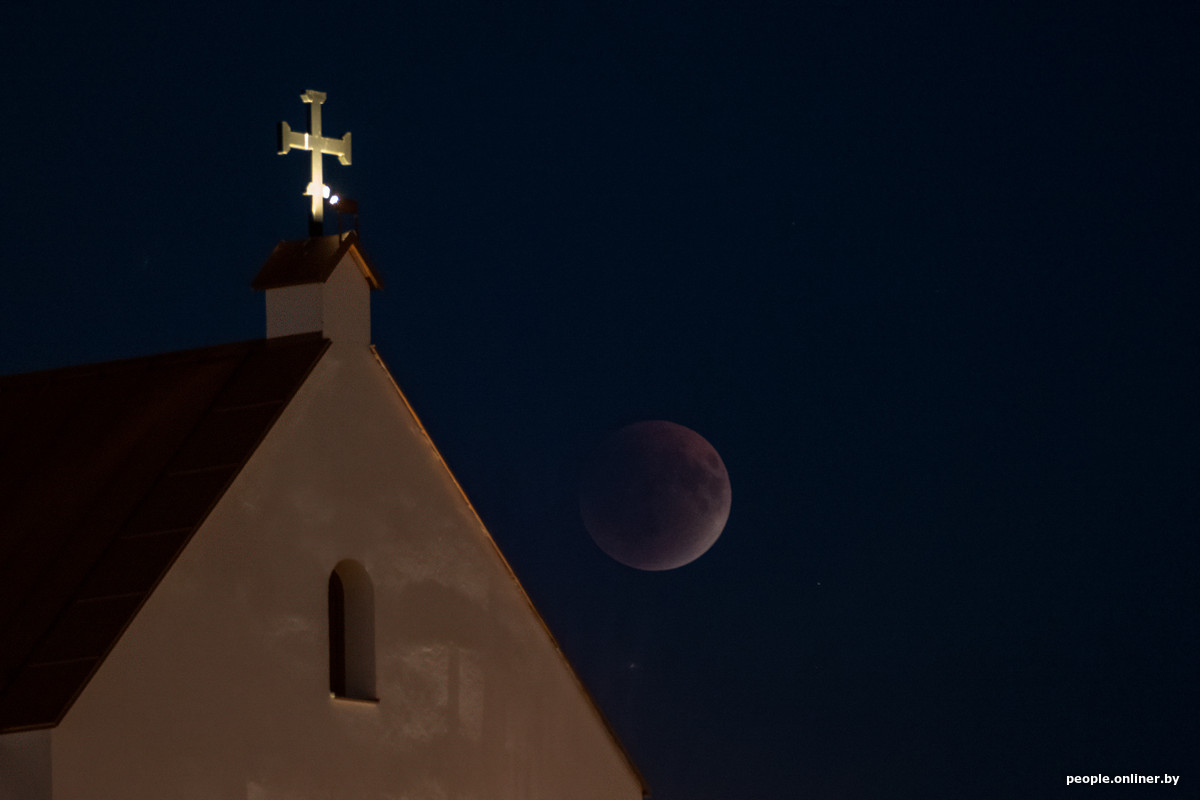 Красная луна на фоне креста католического храма в Новой Боровой. Сентябрь, Минск.