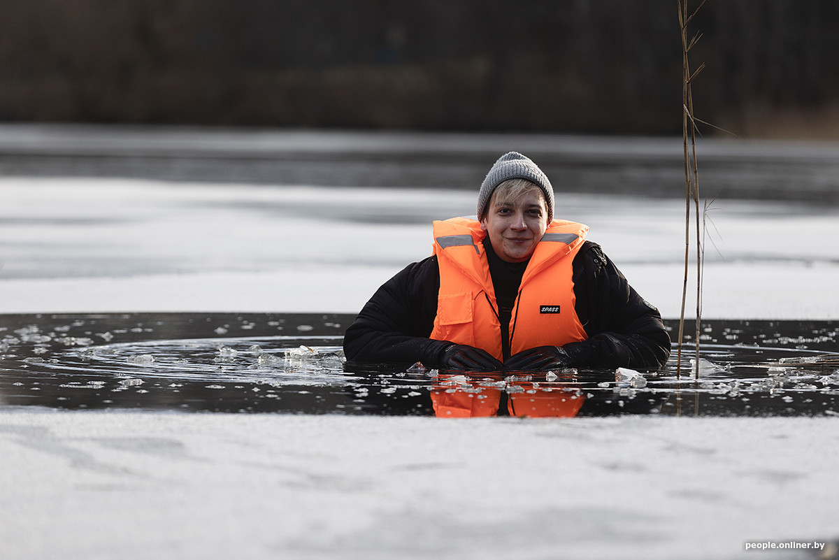 Журналист Onliner Саша Маниту ожидаемо провалился под лед во время учений с ОСВОД. Январь, Минский район.