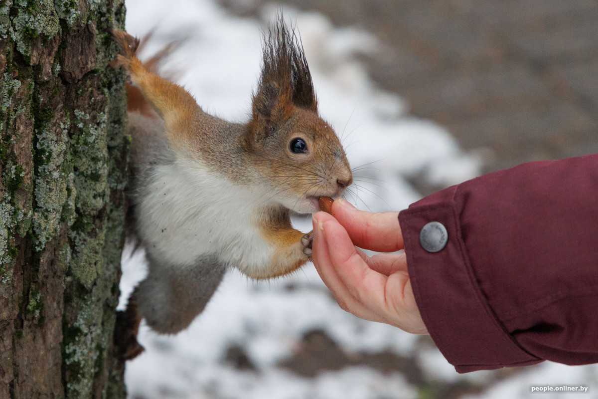Прохожие кормят белку в Лошицком парке. Ноябрь, Минск.