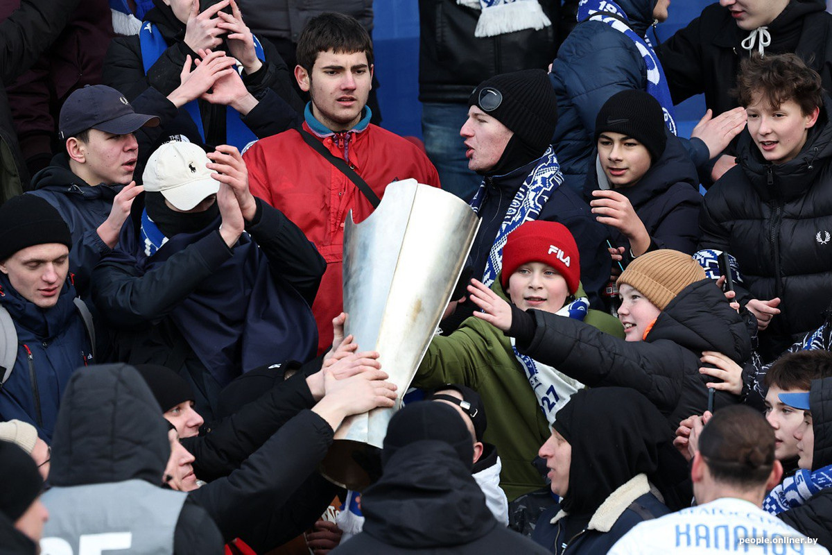Минское «Динамо» празднует с болельщиками победу в матче за Суперкубок Беларуси. Февраль, Минск.