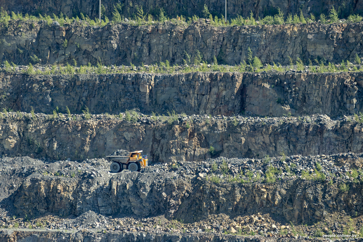 Самосвал БЕЛАЗ работает в гранитном карьере под Микашевичи. Август, Лунинецкий район.