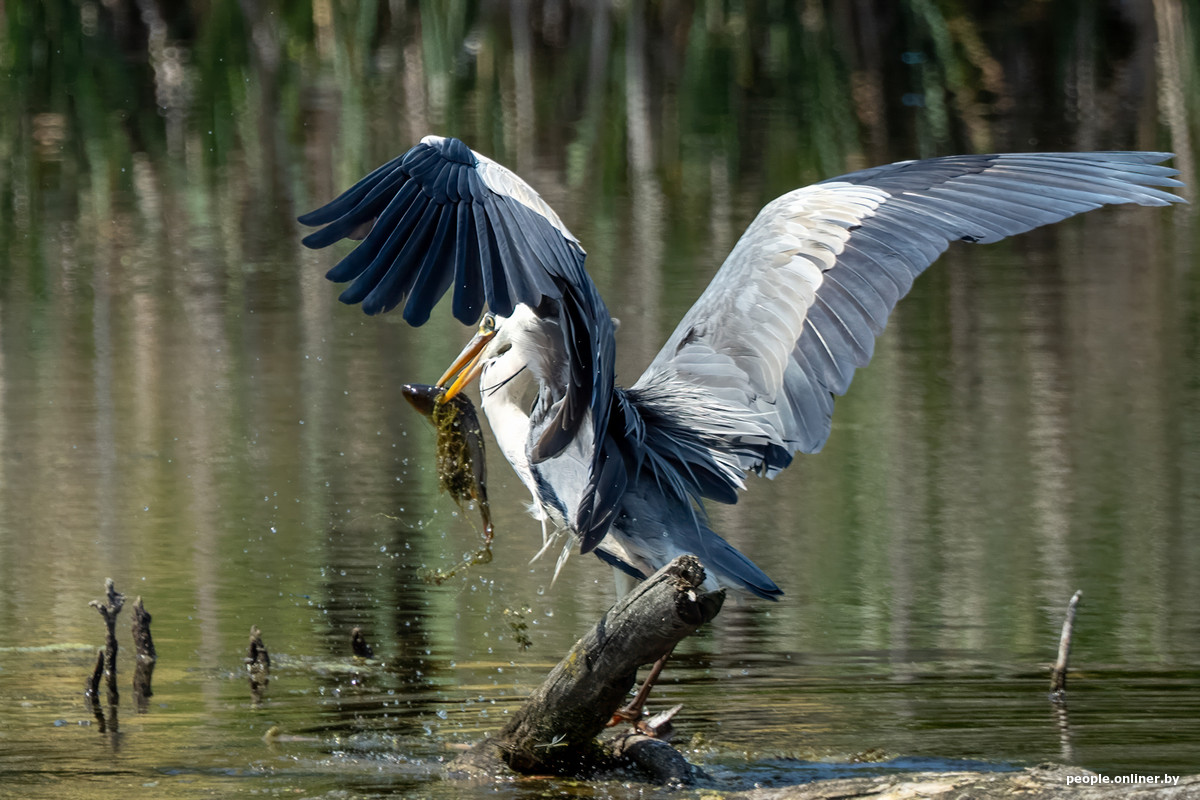 Серая цапля ловит рыбу на реке Тростянка. Июнь, Минск.