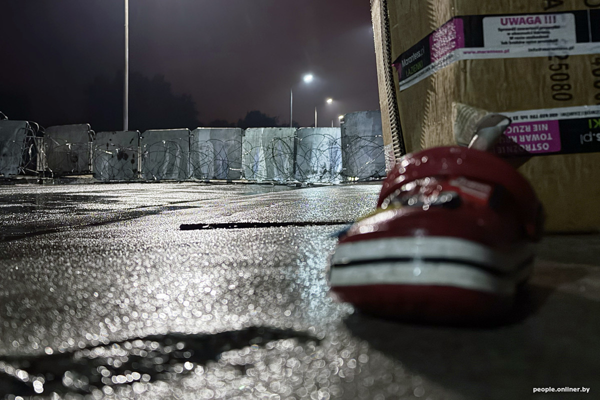 Резиновый тапок на фоне металлических щитов. В сентябре Польша временно закрыла погранпереходы на границе с Беларусью. Брестский район.