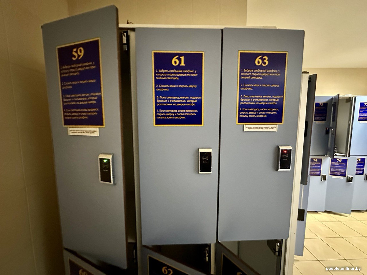 Визуально ничего необычного. Как и в других подобных местах, шкафчики открываются и закрываются после прикосновения браслетом. Главный плюс в том, что шкафы оснащены крючками и одежду можно спокойно развесить.