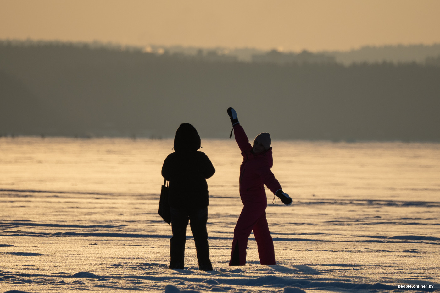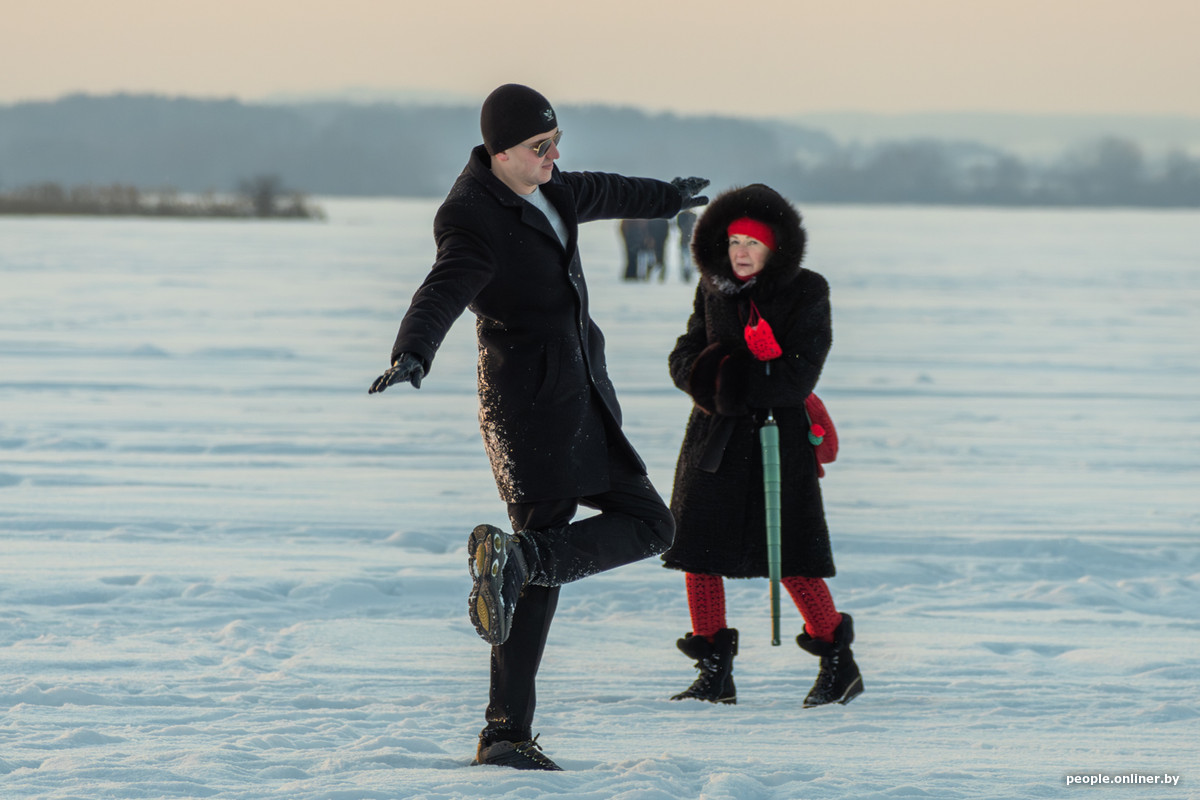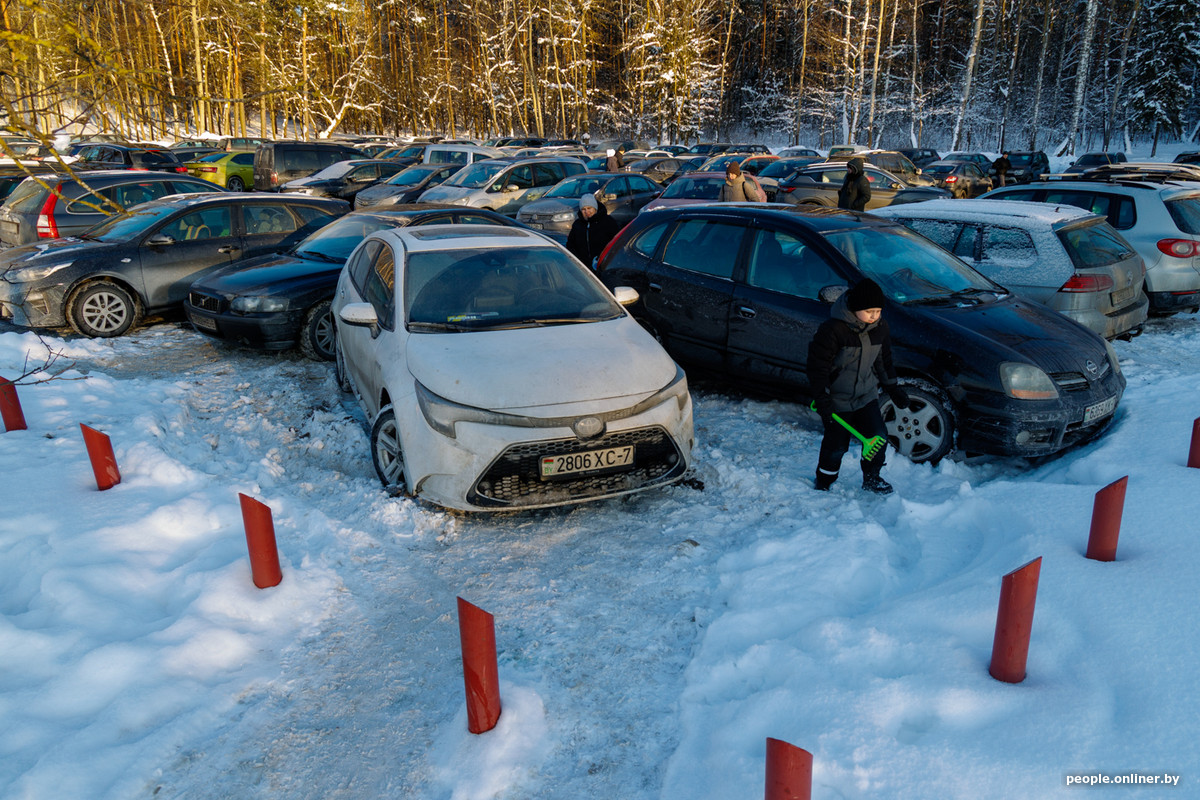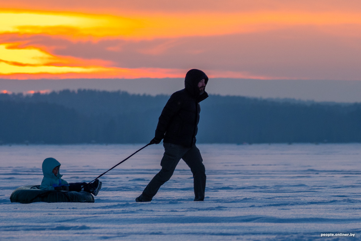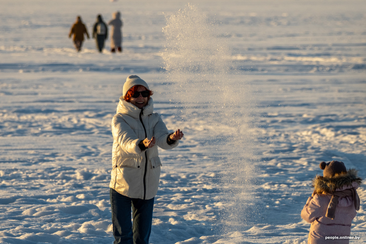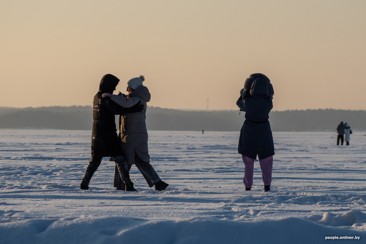 Народ едет за удовольствиями: прогуляться с собакой по заснеженному берегу Минского моря, устроить необычное свидание. Многие приезжают целенаправленно ради фотосессии на закате.