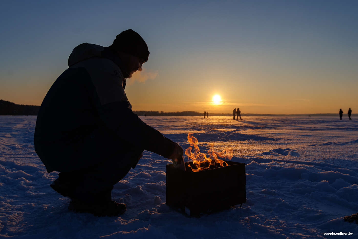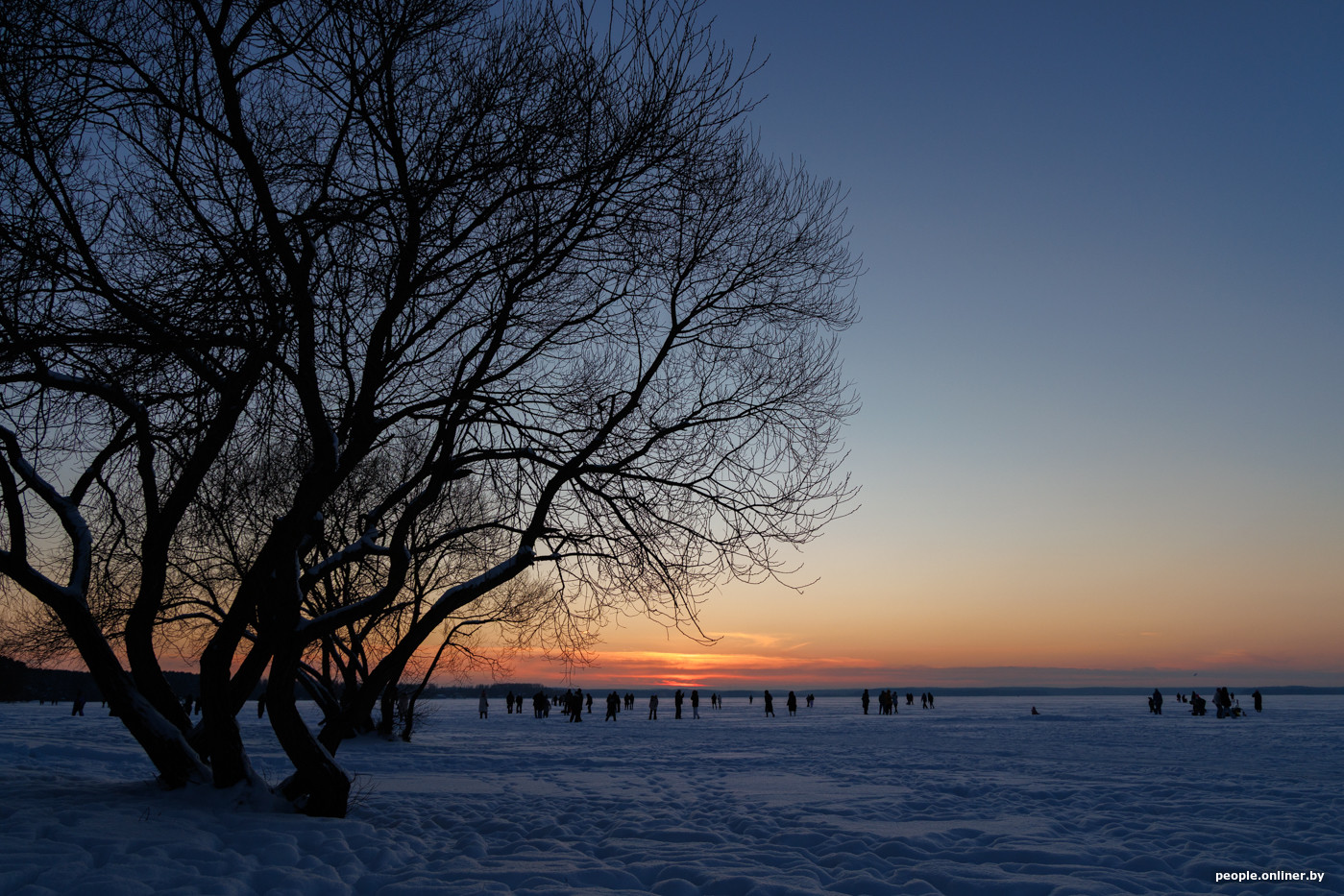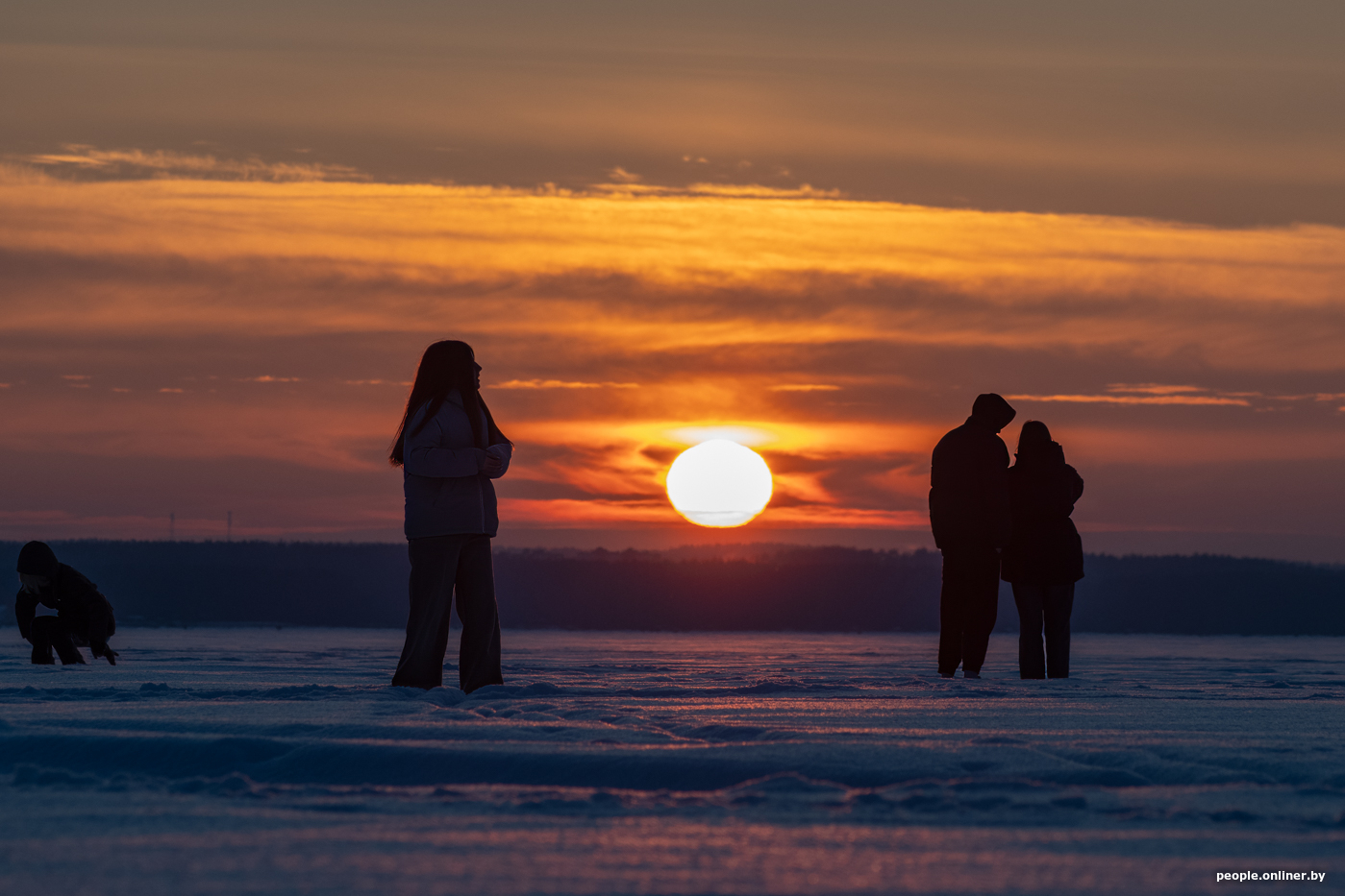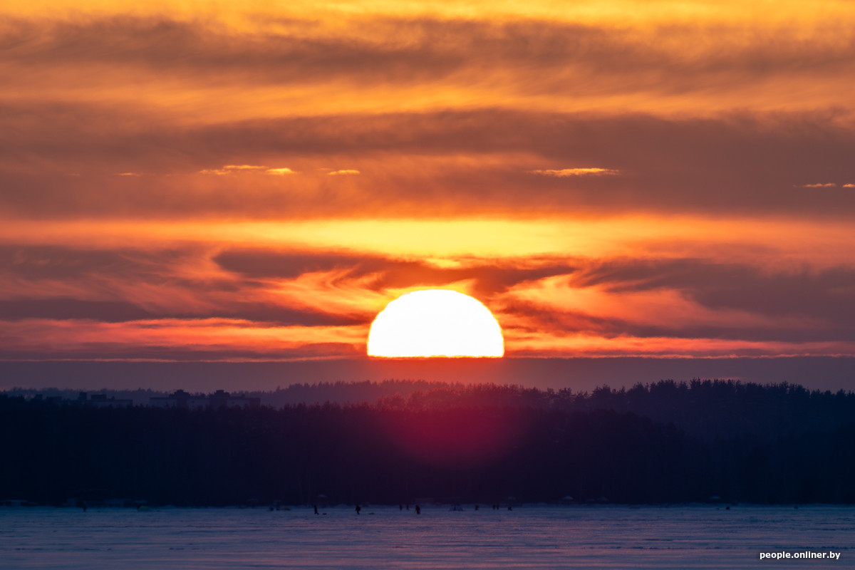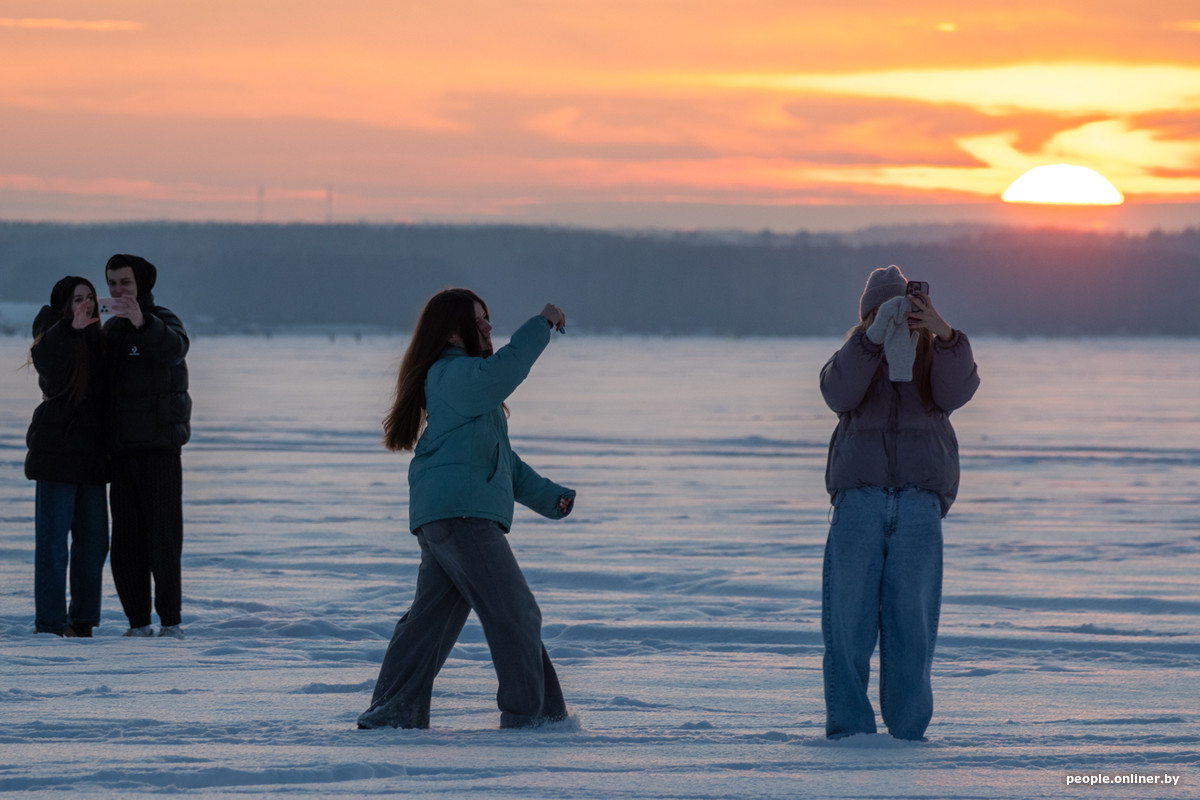 Закаты в Беларуси не такая уж редкость, в отличие от северного сияния, за которым обычно выходят охотиться всем интернетом. Но и обычный зимний вечер может выглядеть атмосферно. Наш фотограф побывал на Минском море и снял, каким был закат в этот морозный вечер и какими были люди, которые пришли его увидеть.