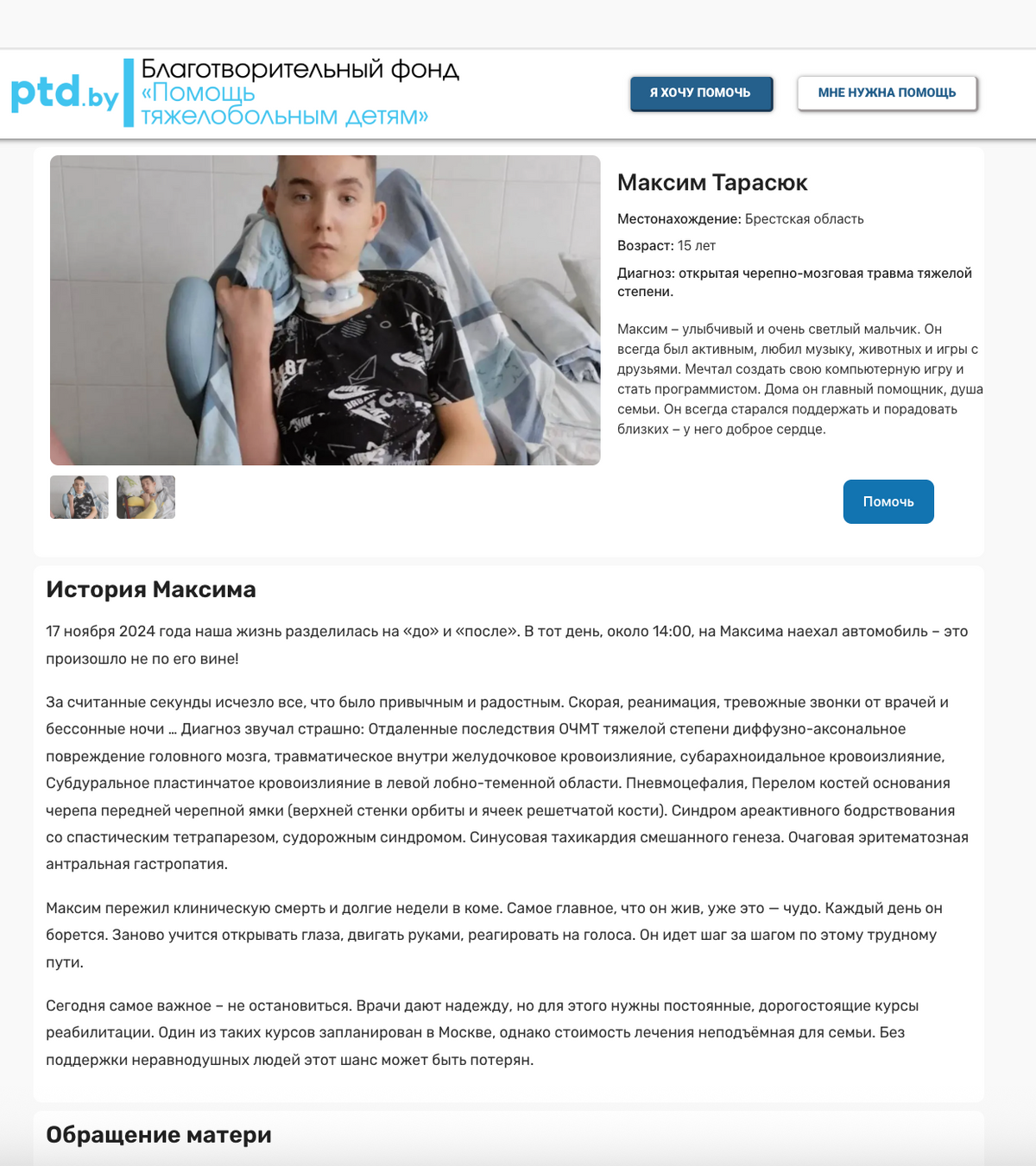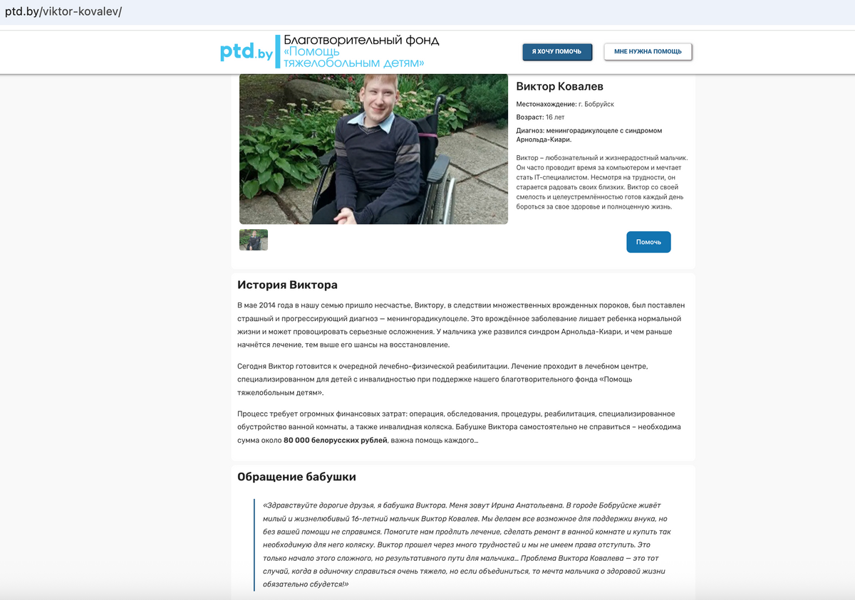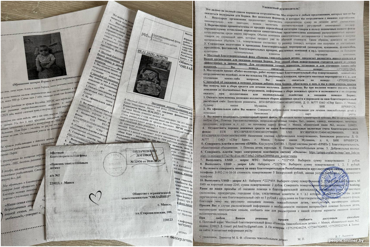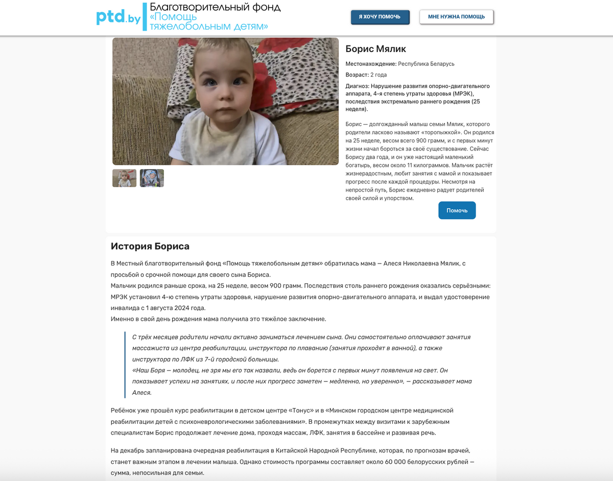Вот что пишет фонд: «На декабрь запланирована очередная реабилитация в Китайской Народной Республике, которая, по прогнозам врачей, станет важным этапом в лечении малыша. Однако стоимость программы составляет около 60 000 белорусских рублей — сумма непосильная для семьи. По совету знакомых, ранее получивших помощь, Алеся обратилась в местный благотворительный фонд „Помощь тяжелобольным детям“. Директор фонда Вячеслав Григорьевич незамедлительно согласился оказать содействие и помочь организовать сбор средств. Семья надеется, что неравнодушные люди откликнутся и помогут Борису пройти этот жизненно важный этап лечения».
