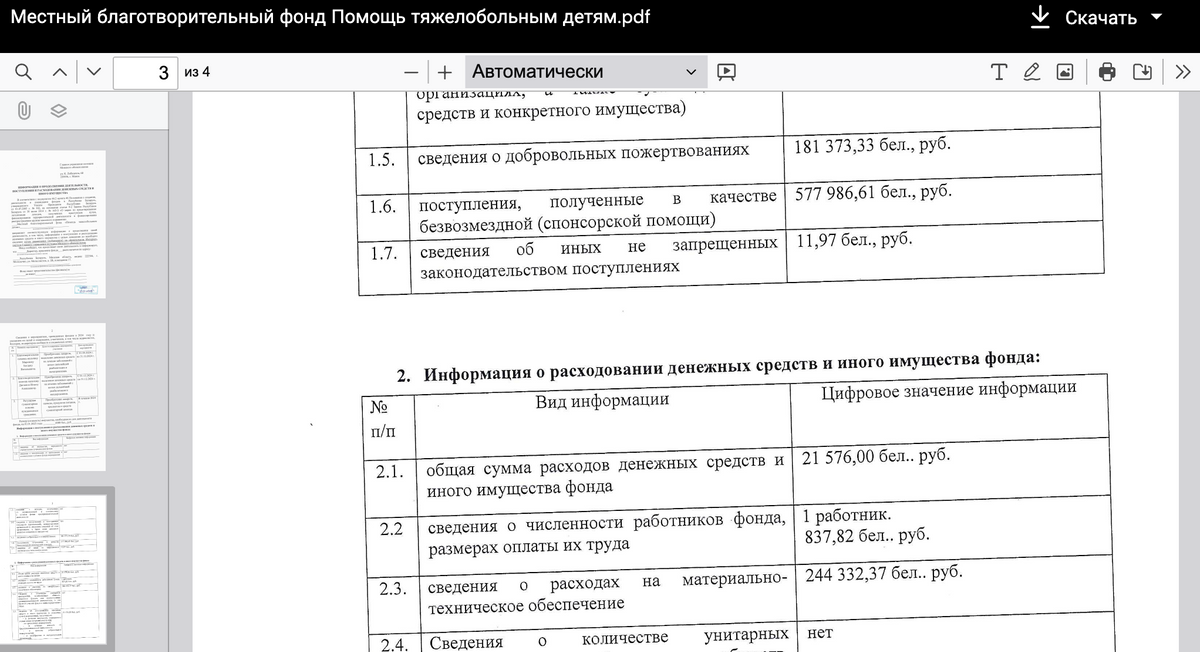 Редакции также известно как минимум о двух случаях, когда благотворительный фонд «Помощь тяжелобольным детям» не предоставил юрлицам отчеты. То есть деньги на лечение детей ушли, а подтверждающих документов об этом по запросу предоставлено не было. «Насчет юридических [лиц]. Мы заключаем договор на оказание помощи и обязаны отчитаться, на что были потрачены средства. И если кому-то там что-то не нравится, то мы не противоречим законодательству Беларуси и нашему уставу. Все», — убеждал нас ранее Вячеслав Лысенков.