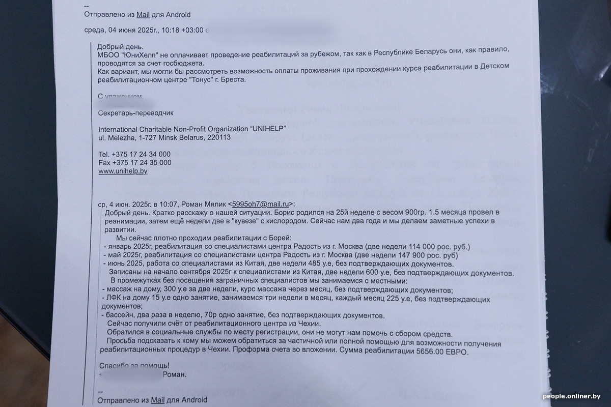 Летом 2025 года Мялики стали искать чешскую клинику. На поездку, по подсчетам Романа, требовалось около €7 тыс. В июне он начал рассылать письма во всевозможные фонды. Так, собственно, и вышел на Лысенкова.