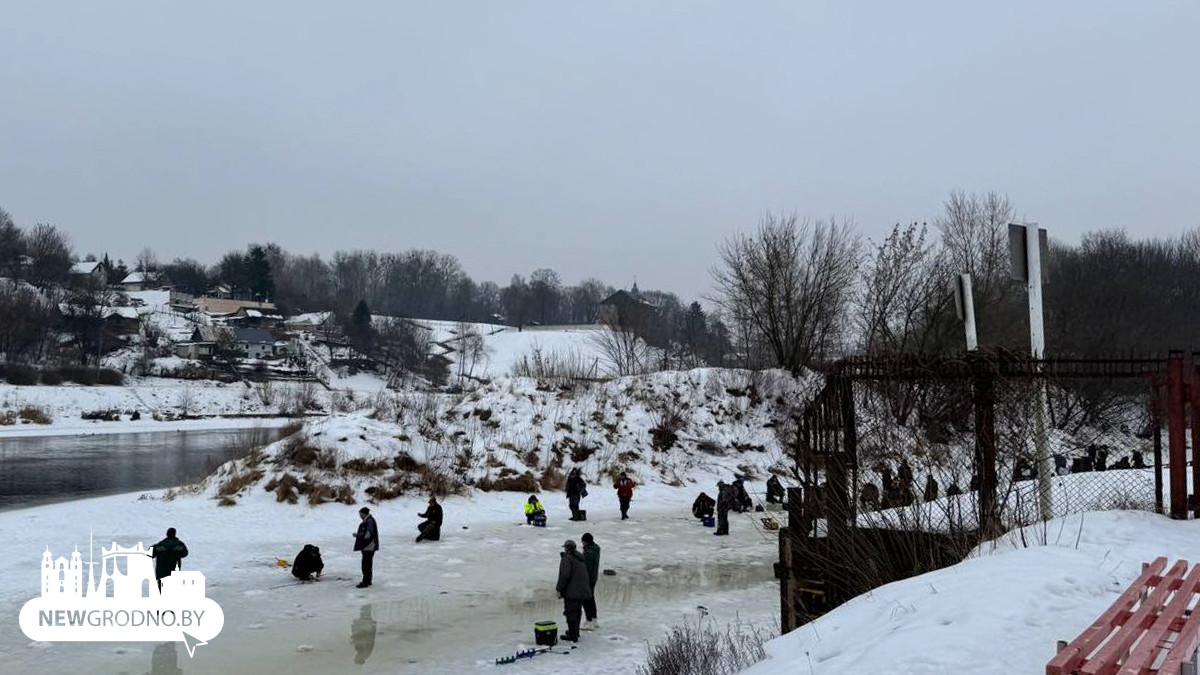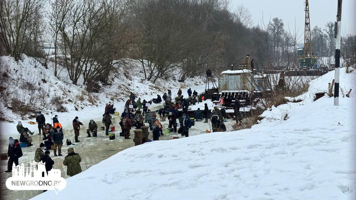 Необычную картину вчера заметили в Гродно: десятки человек собрались на льду небольшой затоки Немана. Одна из версий, что могло так привлечь собравшихся, — возможность хорошего улова.