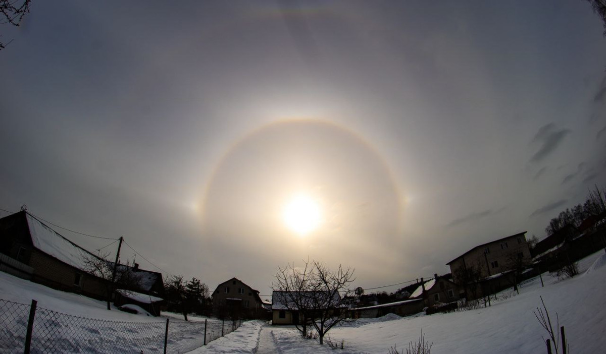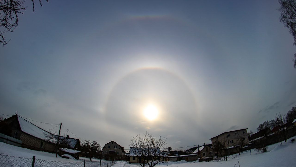 Сегодня в небе над Беларусью можно было увидеть редкое оптическое явление — гало. Вокруг солнца появилось сразу несколько светящихся элементов.