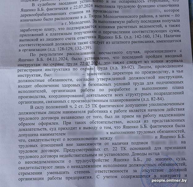 Как заявил директор, трудовой договор с Брониславой он не подписывал и сделать этого не мог в принципе: был в отпуске. Вместо него и без его ведома это сделала бухгалтер предприятия. Проводилась проверка — в объяснении бухгалтер этот факт не оспаривала. Также истец заявлял, что о цехе в Молодечно и работе там Брониславы он узнал в день происшествия. Соответственно, никаких документов, собеседований и инструктажей тоже не проводил, руководил производством в другом городе, доступа к документам основного офиса не имел. Бронислава же в суде заявила, что писала на имя директора заявления о приеме на работу и отпуске, а один раз виделась с ним лично.
