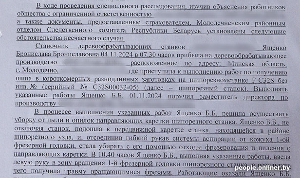 Параллельно после случившегося шло разбирательство. По словам Брониславы, всем занялась инспекция по труду. Необходимо было составить акт о несчастном случае и пройти медико-реабилитационную комиссию. Там женщине чуть позже установили III группу инвалидности — что важно, рабочую.