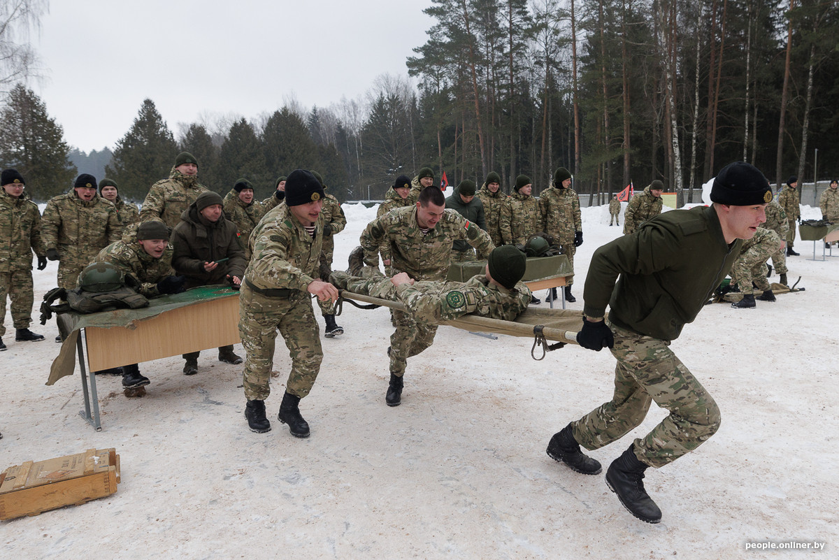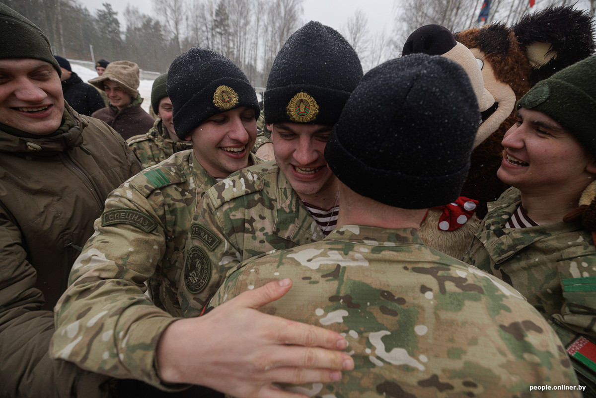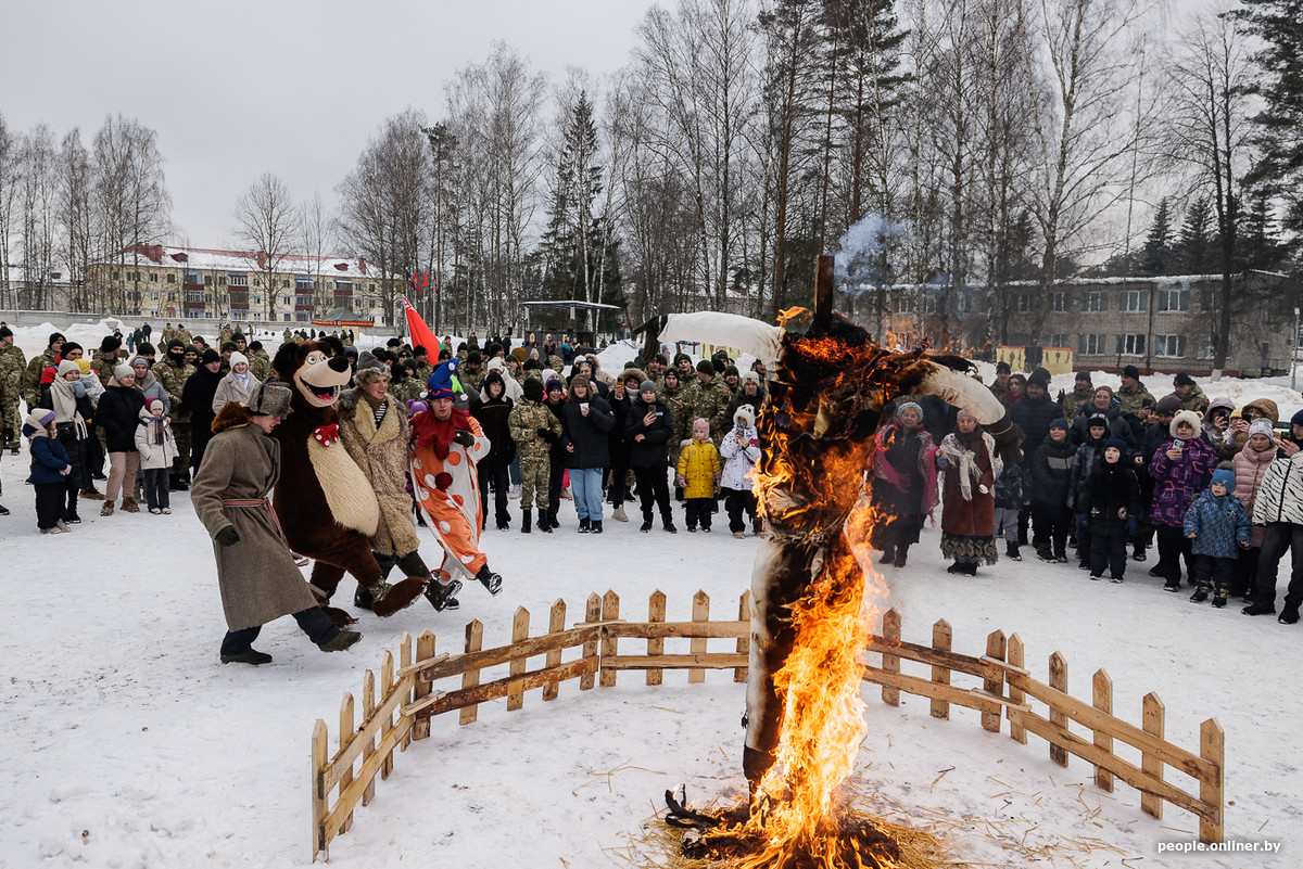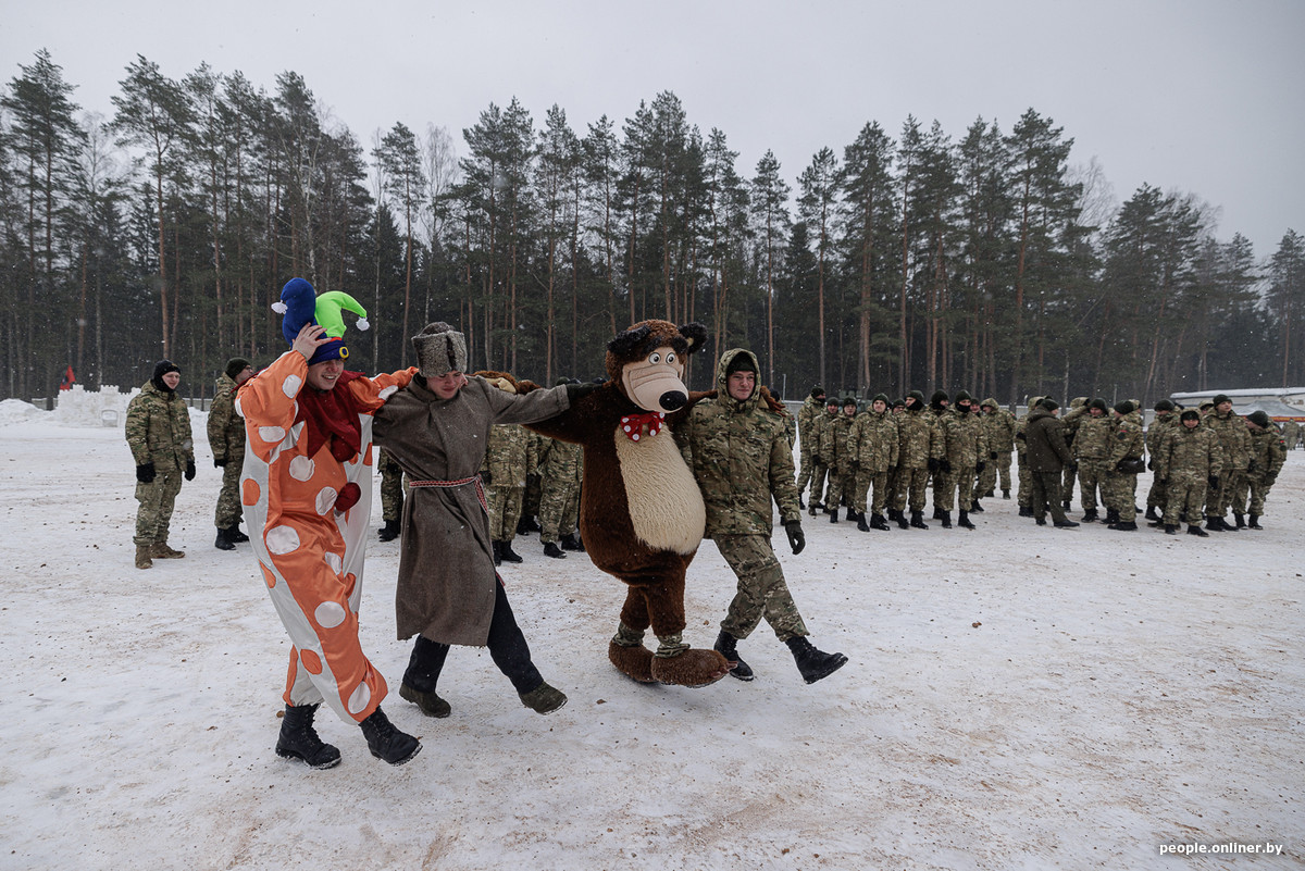 В воскресенье по всей Беларуси размашисто провожали зиму. Не прошли мимо Масленицы и во внутренни войсках МВД Республики Беларусь. В войсковой части 3310, расположенной в Околице, устроили борьбу на снегу, соревнования по перетягиванию каната и накормили всех желающих кашей. На месте побывал фотокорреспондент Onlíner и вернулся с атмосферным фоторепортажем.