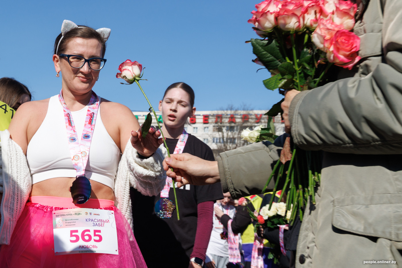 На финише участниц ждали медали, цветы и поздравления. Многие девушки встречали родных и друзей, которые пришли поддержать их с букетами.