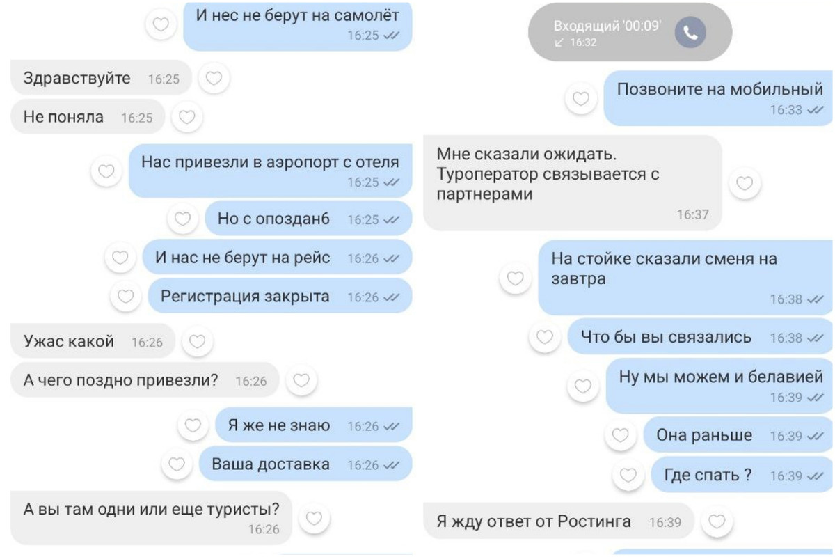 Дмитрий заявляет, что сразу же сообщил обо всем турагенту из витебской компании «Велл». В переписке ему сказали покупать новый билет, но сохранять все чеки на дополнительные расходы. По словам туриста, он с другом в итоге купил билеты на ближайший рейс из Дубая в Москву и самостоятельно добирался до Минска. Дополнительные траты потянули на $1000 (по $500 на каждого). «А если бы у нас не было денег на билеты?» — задается вопросом читатель.