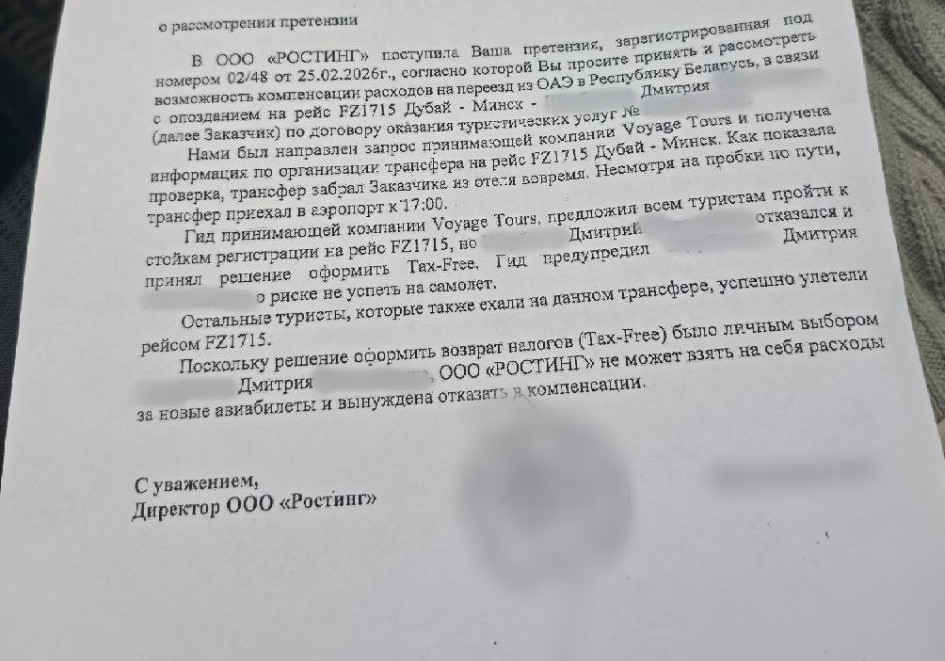 «Остальные туристы, которые также ехали на данном трансфере, успешно улетели рейсом FZ1715. Поскольку решение оформить возврат налогов (Tax Free) было личным выбором Дмитрия, ООО „Ростинг“ не может взять на себя расходы на новые авиабилеты и вынуждено отказать в компенсации», — говорится в письме.