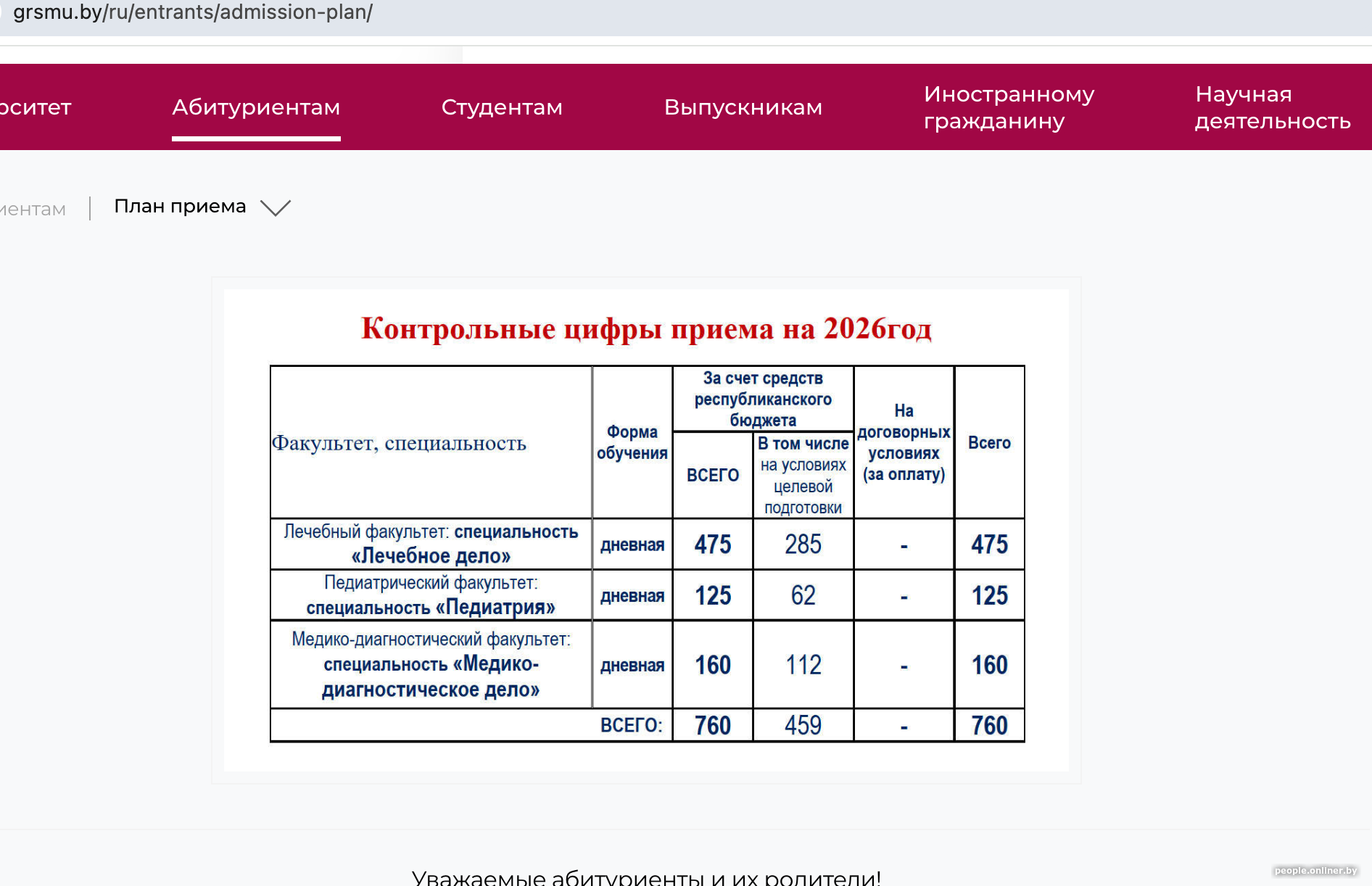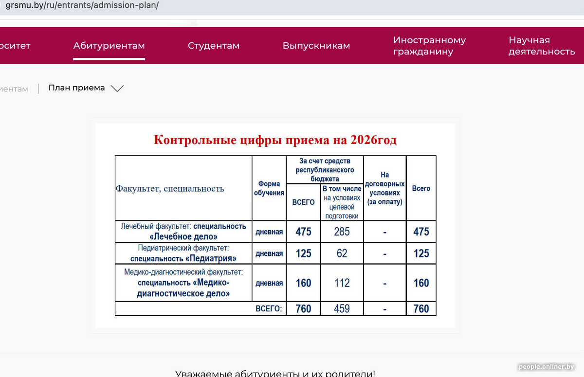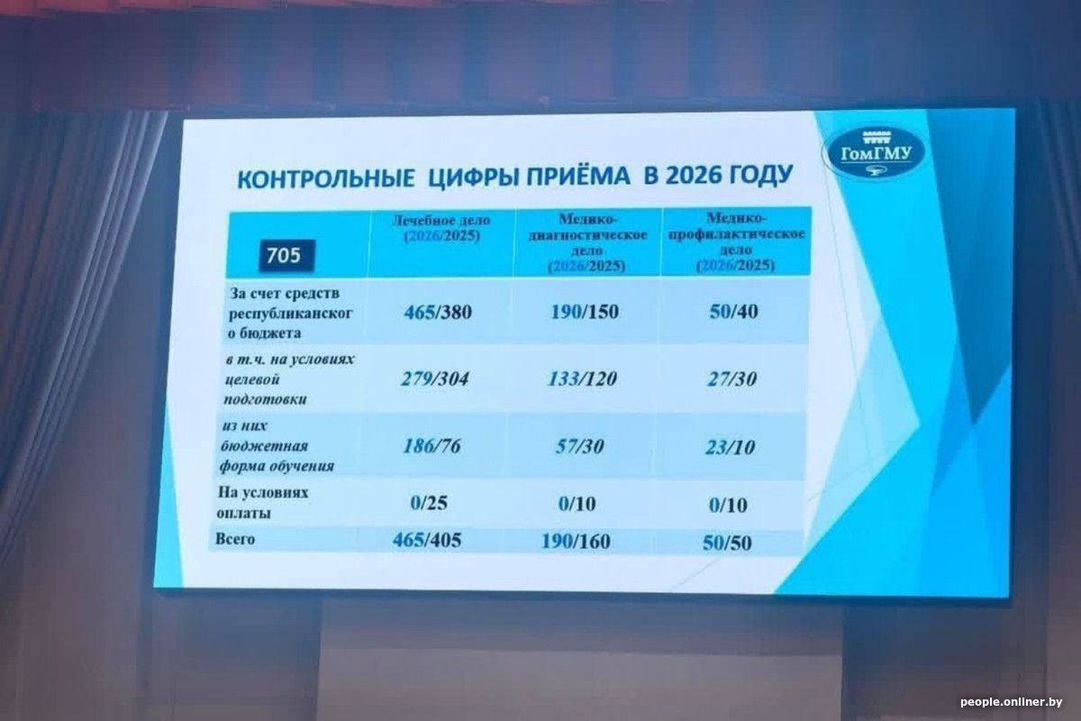 Гродненский государственный медицинский университет первым из профильных вузов опубликовал у себя на сайте цифры приема на 2026 год. Так, в этом году здесь выделено 760 бюджетных мест: 459 для целевиков и 301 на конкурсной основе.