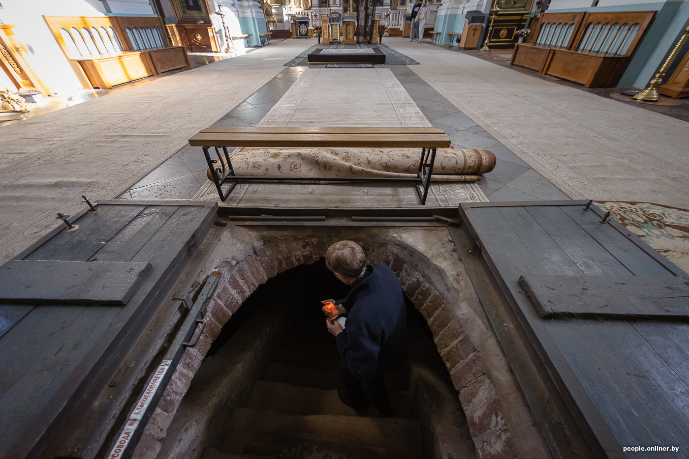 В документах кармелитов описаны «двери лежащие». Увидеть то, о чем упоминали монахи, получается через минуту — как только отбрасывается ковер и эхом раздается звон металлических засовов.