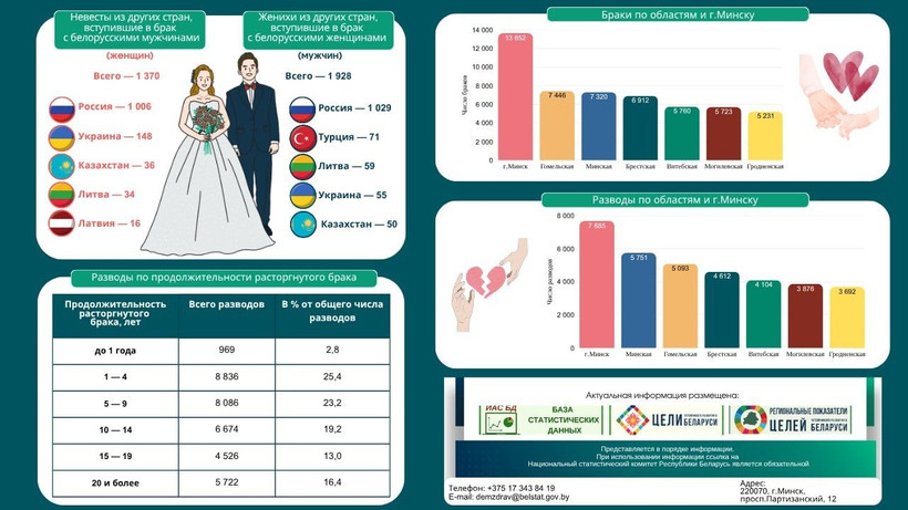 1370 иностранок вышли замуж за белорусов. На первом месте по численности — россиянки (1006), за ними следуют украинки (148) и гражданки Казахстана (36). Замыкают пятерку невесты из Литвы и Латвии.