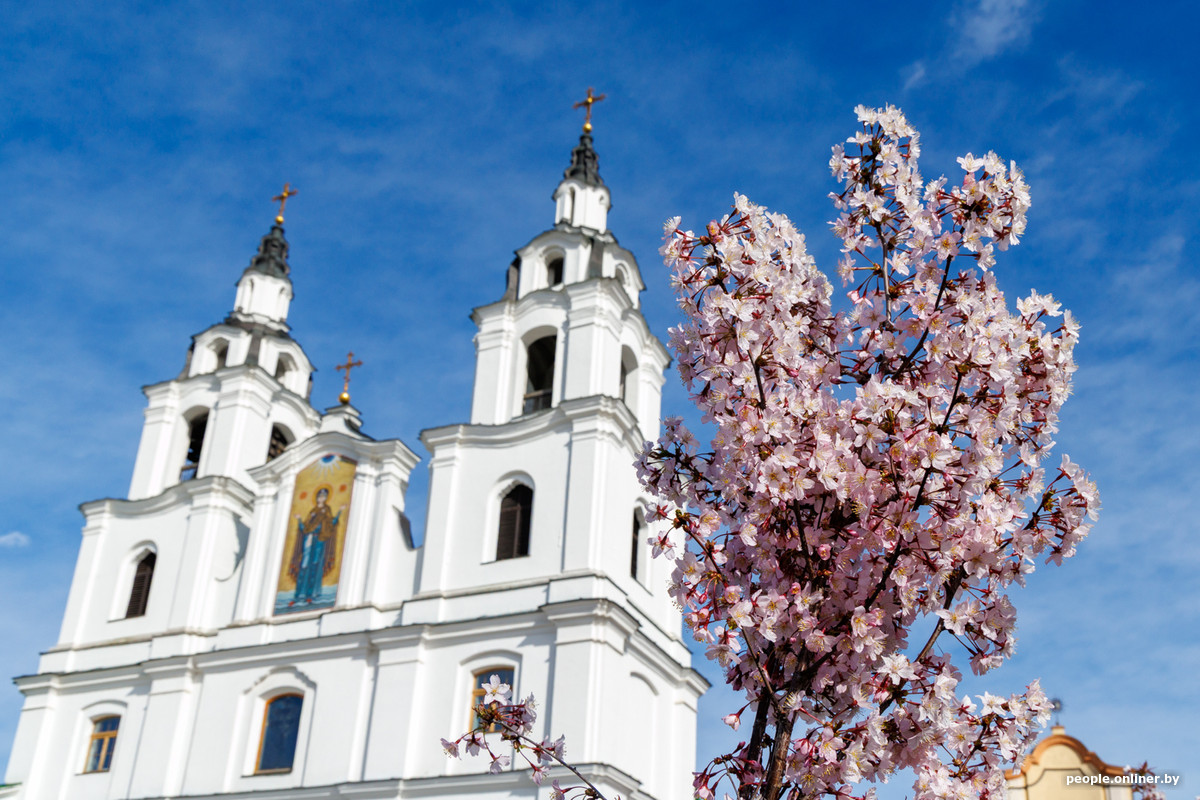 В Японии под цветущими деревьями принято устраивать не только фотосессии, но и пикники. В центре Минска сделать это вряд ли получится: сакура растет прямо у кафедрального собора — но как минимум можно захватить с собой мороженое.