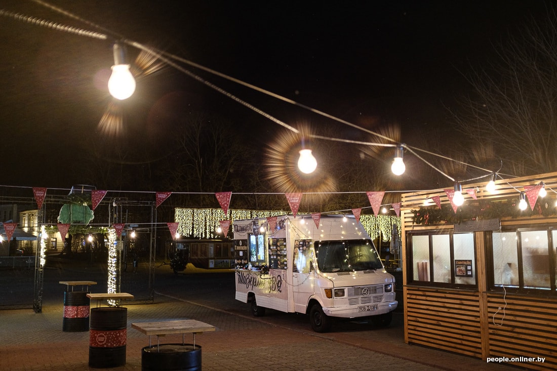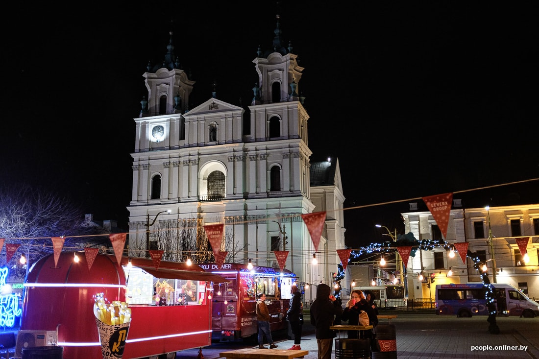 Кстати, взять чай, глинтвейн, кофе с собой можно и на рождественской ярмарке, открывшейся чуть больше недели назад на Советской площади, напротив Фарного костела. Из еды здесь — шаурма, трдельники, берлинеры, пицца и шашлык, из напитков — чаи, кофе и, конечно же, глинтвейн. К слову, вот как выглядит предрождественская площадь прямо сейчас.