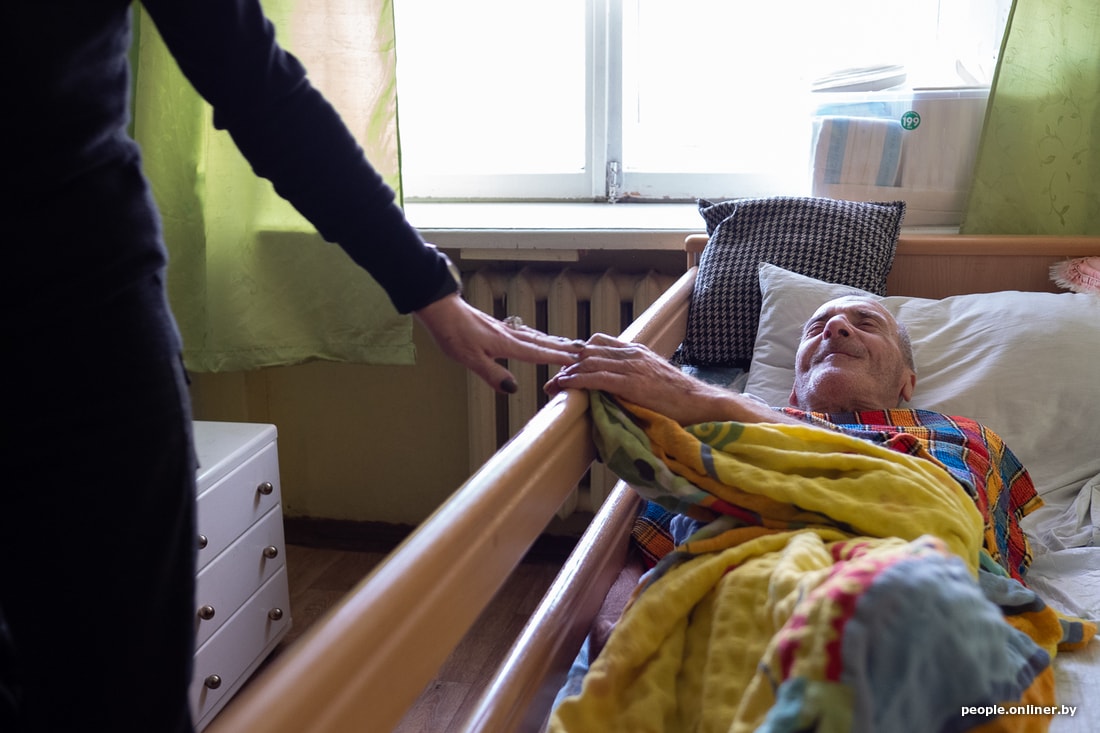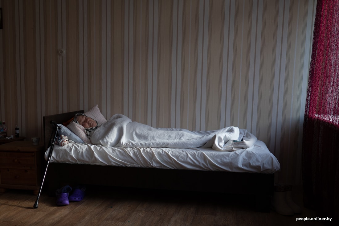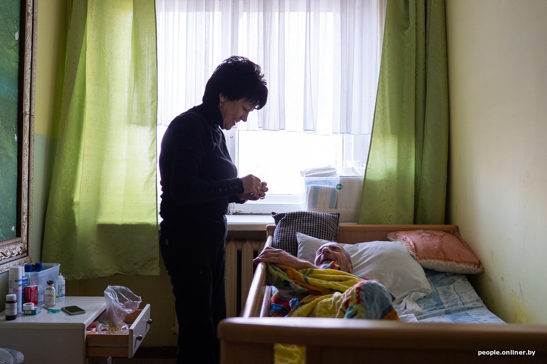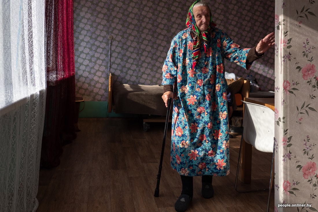— Я родилась в Сморгонском районе. Работала в колхозе, потом — на железной дороге. Вышла замуж, родила четверых детей. Двое уже умерли: дочка в 38, сын в 51 год. Муж тоже умер. Две дочки живы, одна живет в Островце, вторая — в деревне под Сморгонью. Я здесь недавно, около 6 недель, дети пока не навещали. Как сюда попала? Работала-работала, по старости отнялись ноги, стало скакать давление, пропало зрение. Лежала дома на кровати — смотрела в потолок, совсем было тоскливо. Решили с дочками, что пора переезжать сюда. Мне здесь хорошо, вкусно кормят, постель чистая, скажу честно: уход лучше, чем дома. Понятное дело, скучаю по родным, но, как говорится, рыба ищет, где глубже, а человек — где лучше. Наверное, главное, что здесь собрались такие же обиженные жизнью люди, как и я: все больные, старые, нам есть что обсудить. На детей я не обижаюсь: у них своя жизнь, свои проблемы. У меня девять внуков и уже есть правнуки. Пока была копейка какая — помогала. Теперь они помогают мне.