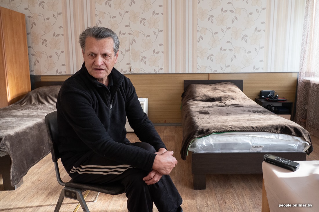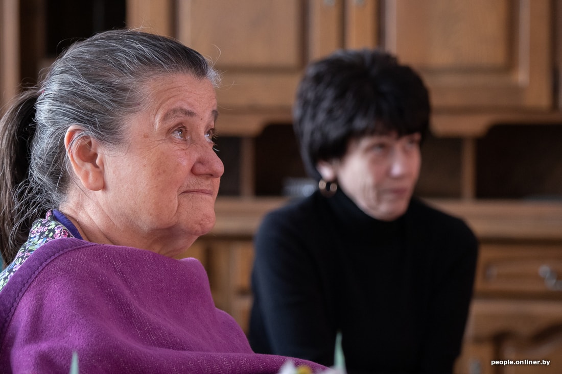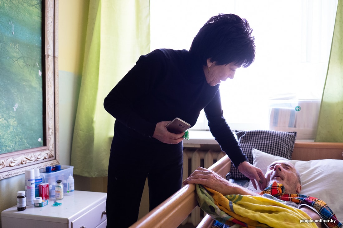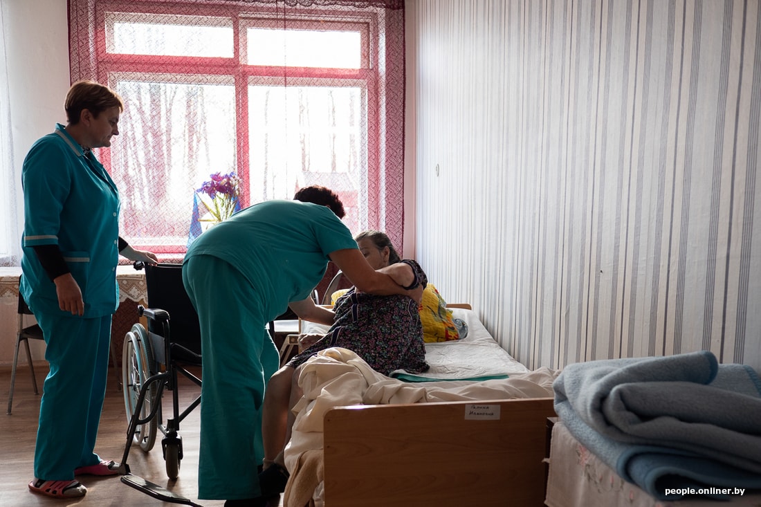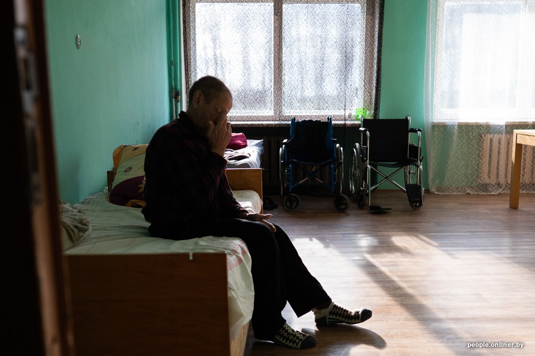 — Я родилась в Сморгонском районе. Работала в колхозе, потом — на железной дороге. Вышла замуж, родила четверых детей. Двое уже умерли: дочка в 38, сын в 51 год. Муж тоже умер. Две дочки живы, одна живет в Островце, вторая — в деревне под Сморгонью. Я здесь недавно, около 6 недель, дети пока не навещали. Как сюда попала? Работала-работала, по старости отнялись ноги, стало скакать давление, пропало зрение. Лежала дома на кровати — смотрела в потолок, совсем было тоскливо. Решили с дочками, что пора переезжать сюда. Мне здесь хорошо, вкусно кормят, постель чистая, скажу честно: уход лучше, чем дома. Понятное дело, скучаю по родным, но, как говорится, рыба ищет, где глубже, а человек — где лучше. Наверное, главное, что здесь собрались такие же обиженные жизнью люди, как и я: все больные, старые, нам есть что обсудить. На детей я не обижаюсь: у них своя жизнь, свои проблемы. У меня девять внуков и уже есть правнуки. Пока была копейка какая — помогала. Теперь они помогают мне.