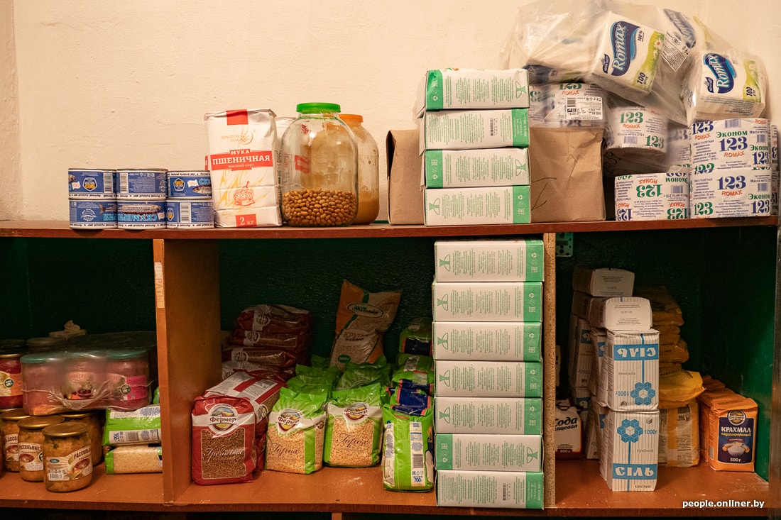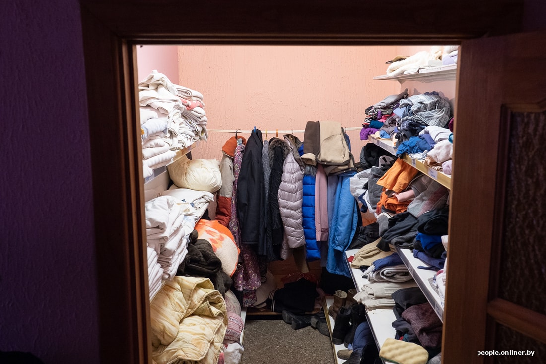Весь антураж подчеркивает простоту быта немощного человека на исходе жизни. На кухне — посуда, в холодильниках — запасы мяса, фруктов и овощей. На складах — стопки постельного белья, моющие и дезинфицирующие средства, взрослые памперсы. Вот ходунки, палочки, костыли и инвалидные коляски, в отдельной комнате — одежда постояльцев. Везде чисто, немного пахнет хлоркой.