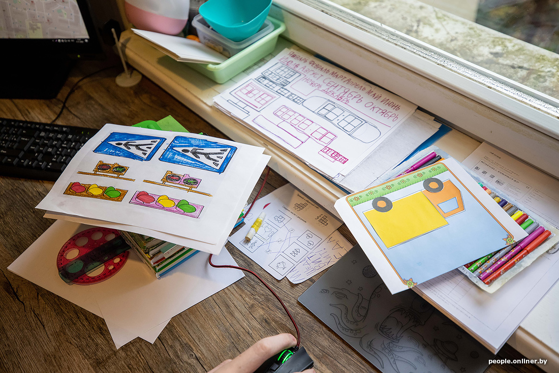 Он уже четыре года учится на дому. На столе хоть и лежат книги за седьмой класс, но давайте смотреть правде в глаза: это спецшкола. Уроки длятся по 20 минут, в основном это математика, русский, белорусский. Сейчас он считает в столбик. Читать ему тяжело. Социализации нет. Мы не общаемся со сверстниками и в целом с другими людьми. В саду тоже были сложности с общением.